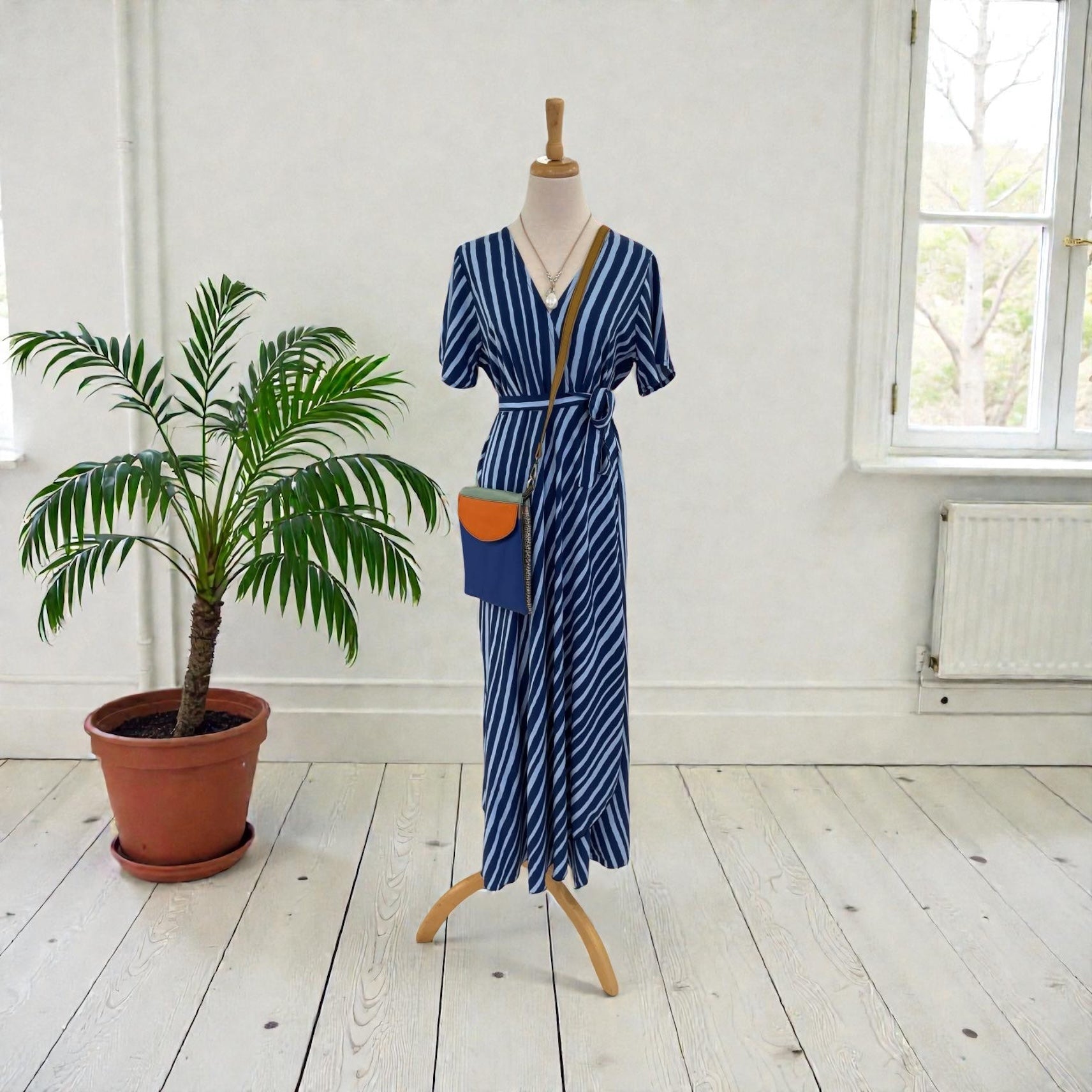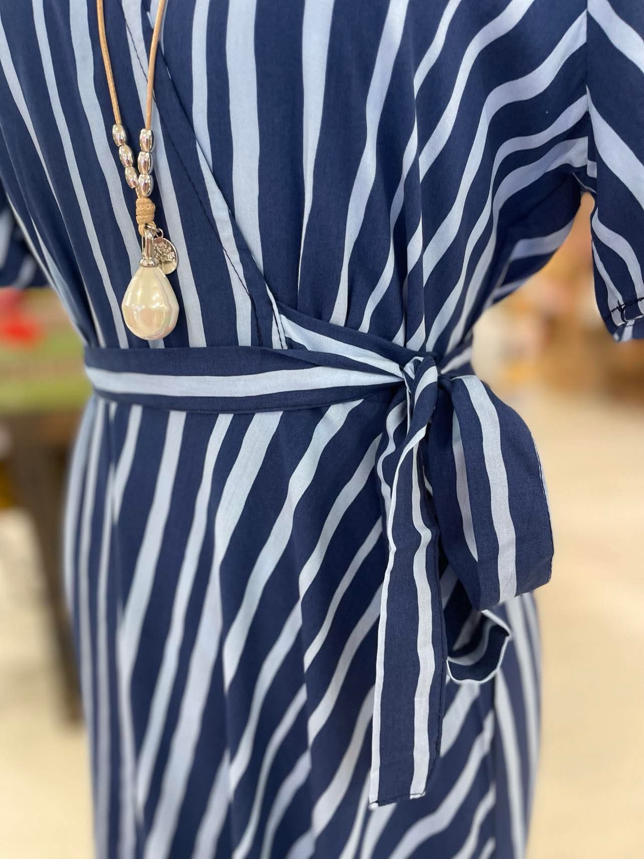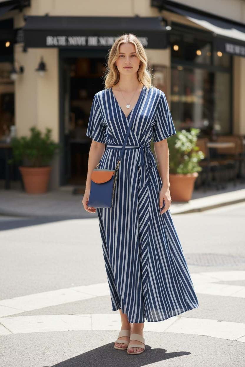 This 100% rayon wrap dress features a classic navy base with soft blue stripe detailing. Designed with a flattering V-neckline, short sleeves and an adjustable tie waist, it offers a comfortable, easy fit with a fluid drape. Lightweight and breathable, it’s an effortless option for everyday wear or casual occasions.