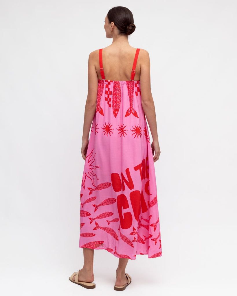 Embrace endless summer with the On the Coast Maxi dress. Featuring bold hot pink and vivid red hues, playful fish motifs, and retro checkerboard details, it brings a joyful seaside vibe. Its lightweight, flowy design and adjustable straps let you switch from classic to strapless for beach-to-bar style. Made from soft, breathable 100% rayon with a pink slip lining, it keeps you comfortable all day. Add this vibrant maxi to your wardrobe and step into the spirit of summer now!