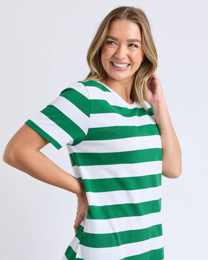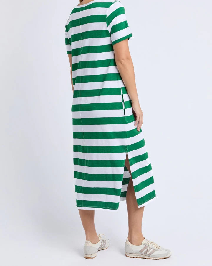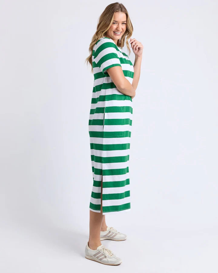 The Tallow Dress by Foxwood combines effortless comfort with smart-casual style — the ultimate everyday dress for warm weather. Crafted from soft, breathable cotton, it features fresh green and white stripes that give a relaxed coastal vibe.