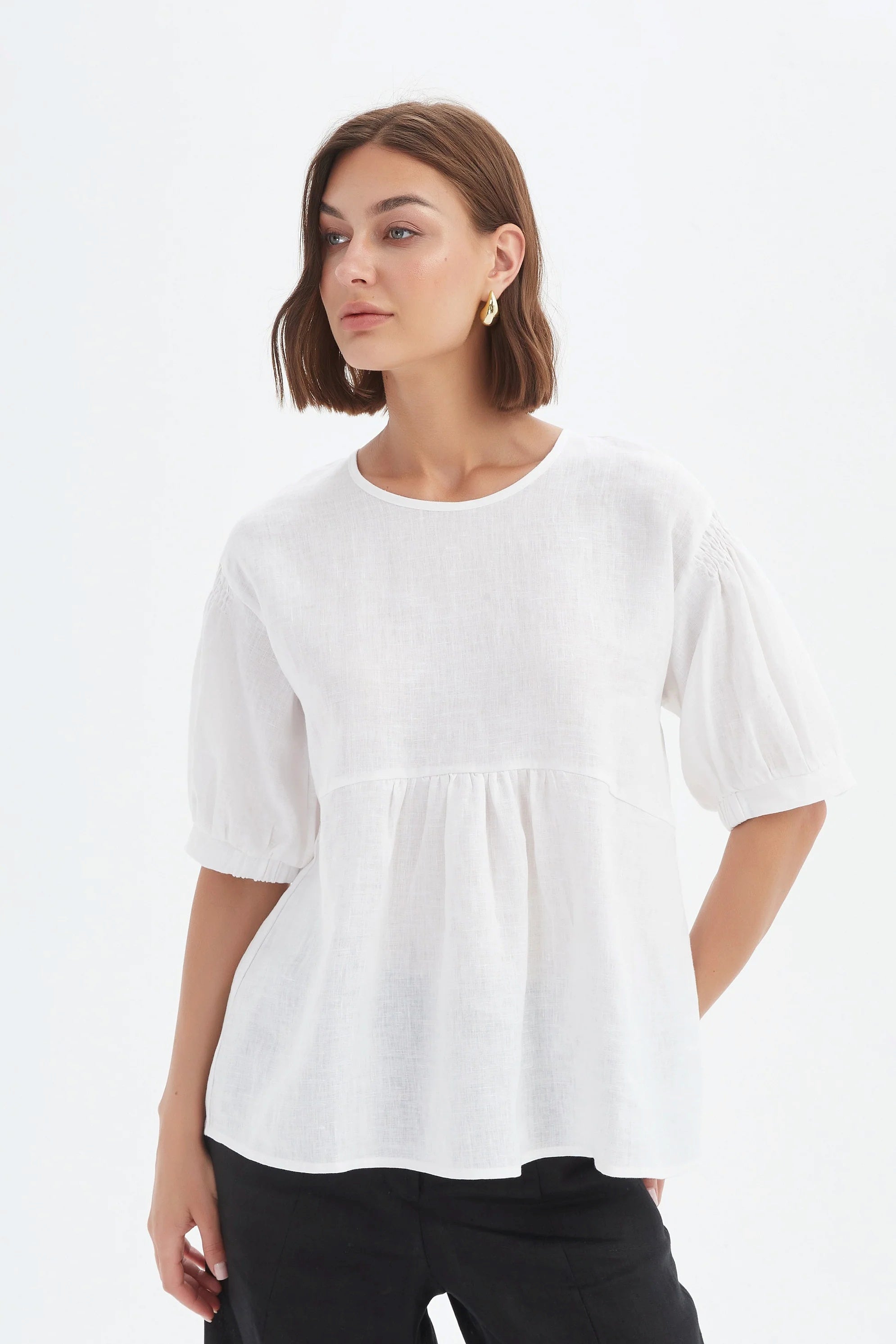 The white colour is all about versatility, making this linen blouse perfect for pairing with denim, skirts, or tailored pants in any shade for effortless everyday wear.