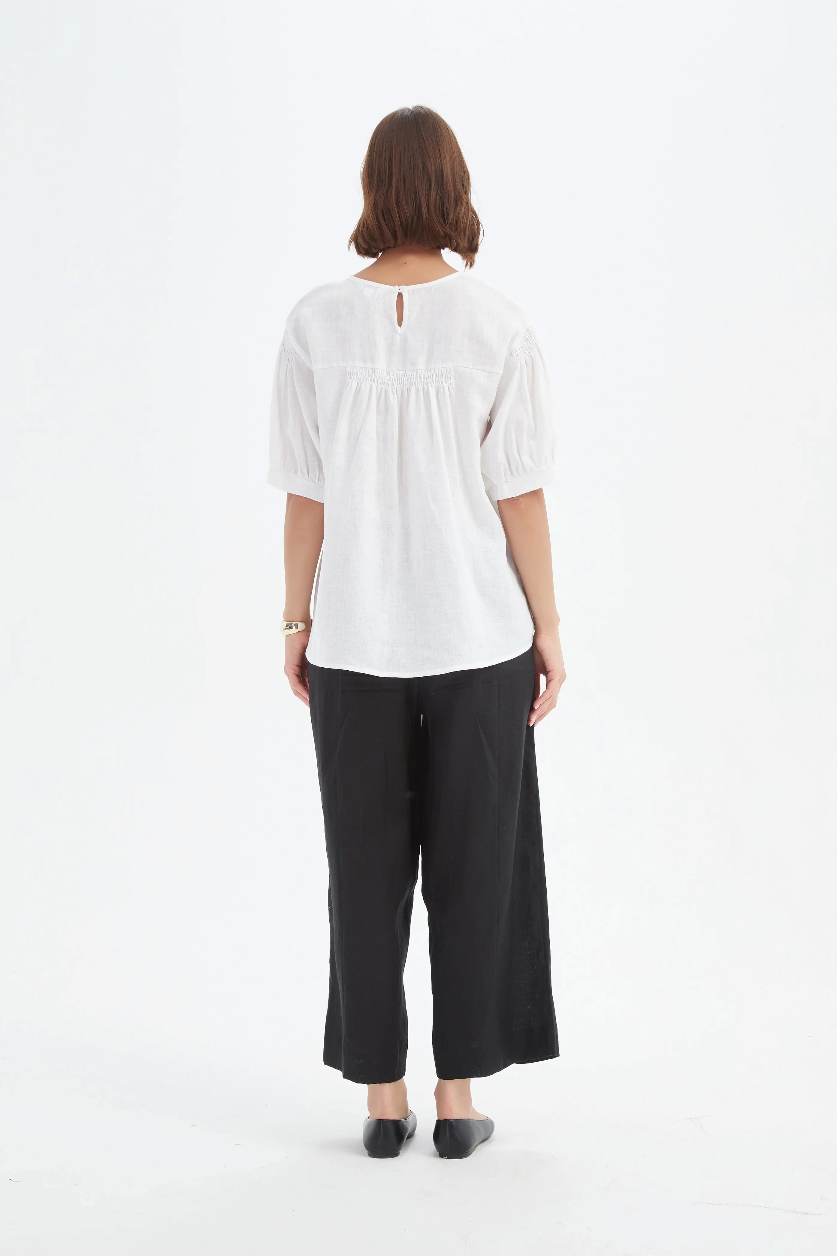 Made from 100% premium French linen, this women’s top blends natural comfort with timeless style. It features intricate shirring on the back and sleeves for a beautifully textured look, while the gathered front and softly billowed bishop sleeves create a relaxed yet refined silhouette.