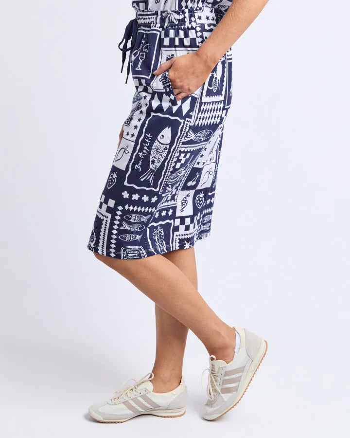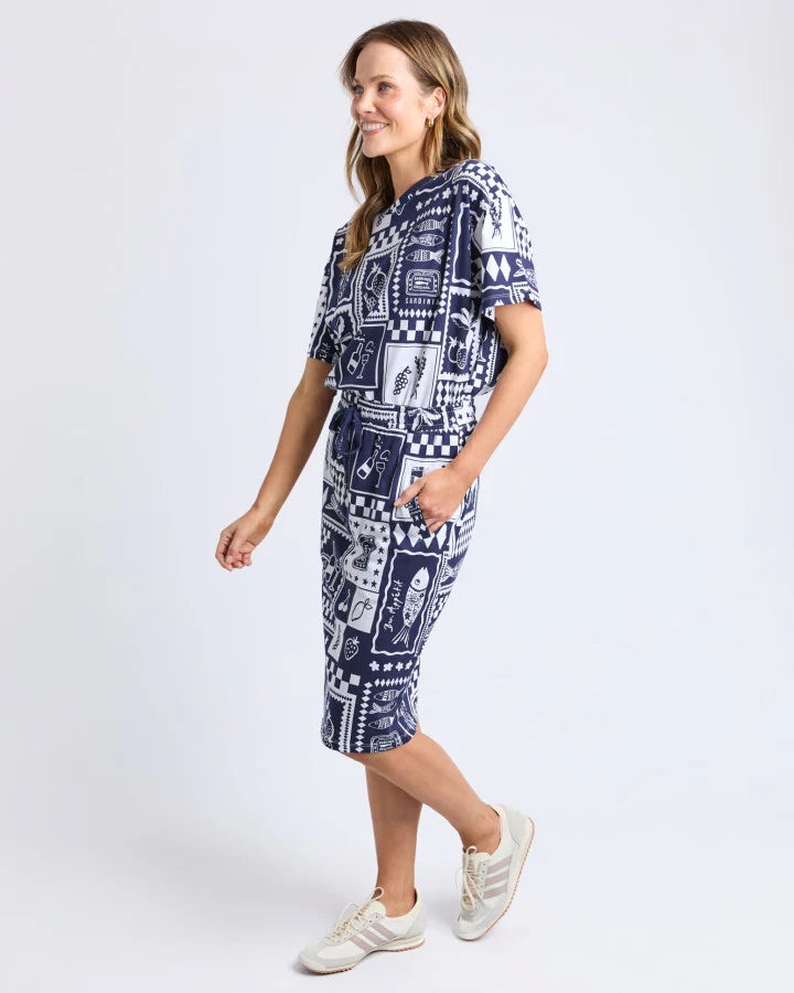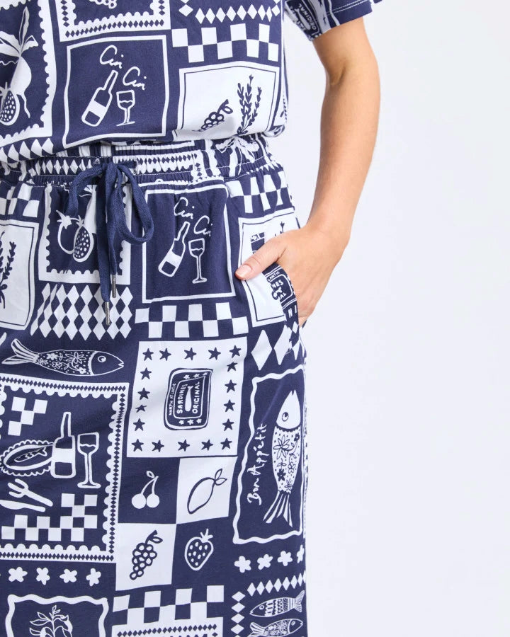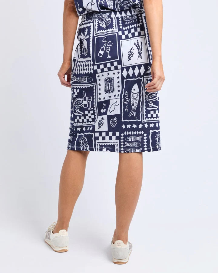 Make everyday dressing fun and effortless with the Chin Chin Skirt by Elm Lifestyle. Featuring a playful naval blue and white print inspired by mini artworks of fish and food, this skirt brings a fresh coastal vibe to your wardrobe. Crafted in Elm’s signature easy-wear fabric, it combines comfort and style — perfect for brunch with friends, weekend getaways, or relaxed travel days.