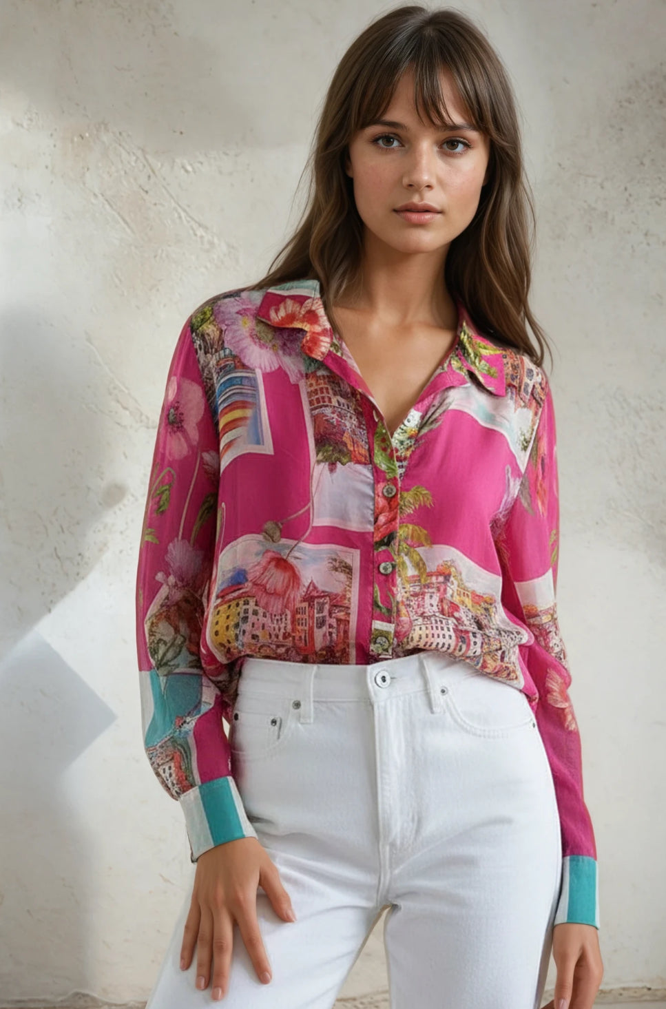 Elevate your wardrobe with the Dolci Shirt – City, a timeless silk blend shirt that blends sophistication with a modern urban edge. Featuring an exclusive cityscape print, this Italian-made women’s shirt captures the energy of city life while maintaining a refined, elegant look.