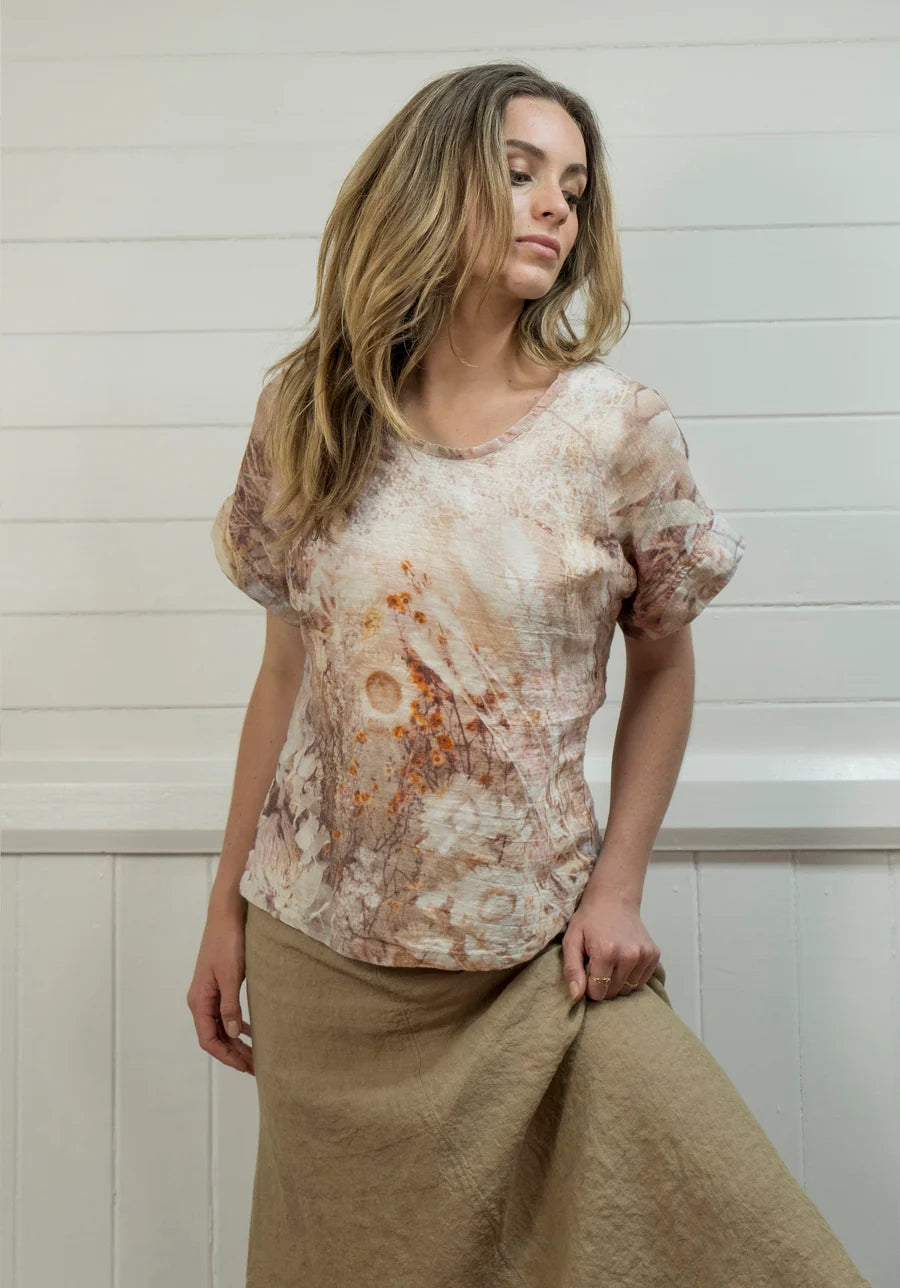 The Dried Flowers Top features a stunning photographic print of dried native blooms, beautifully captured and printed onto natural linen. Each piece showcases Harriet Jane’s signature artistry — blending Australian-inspired imagery with timeless design.