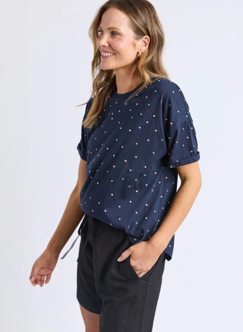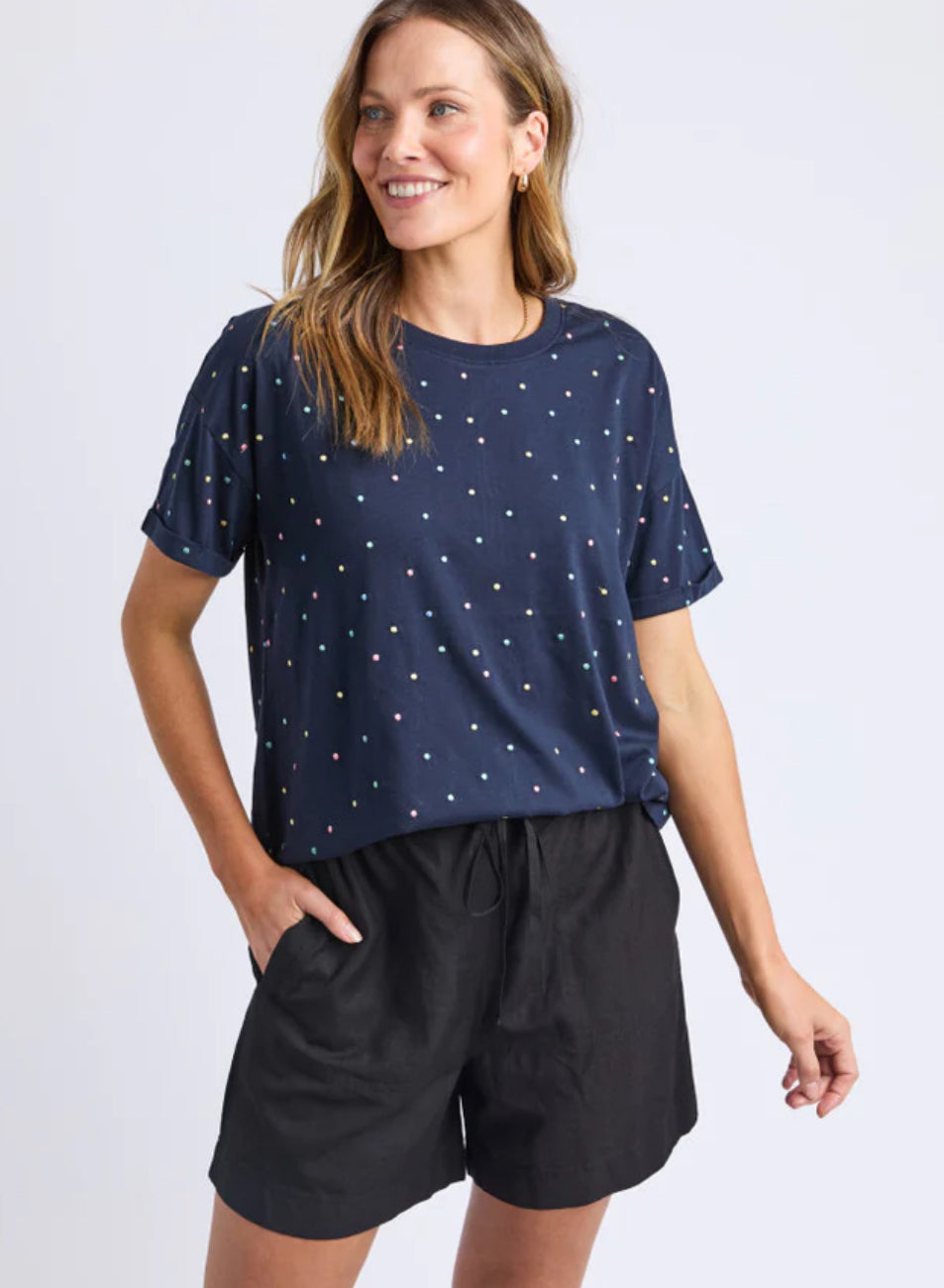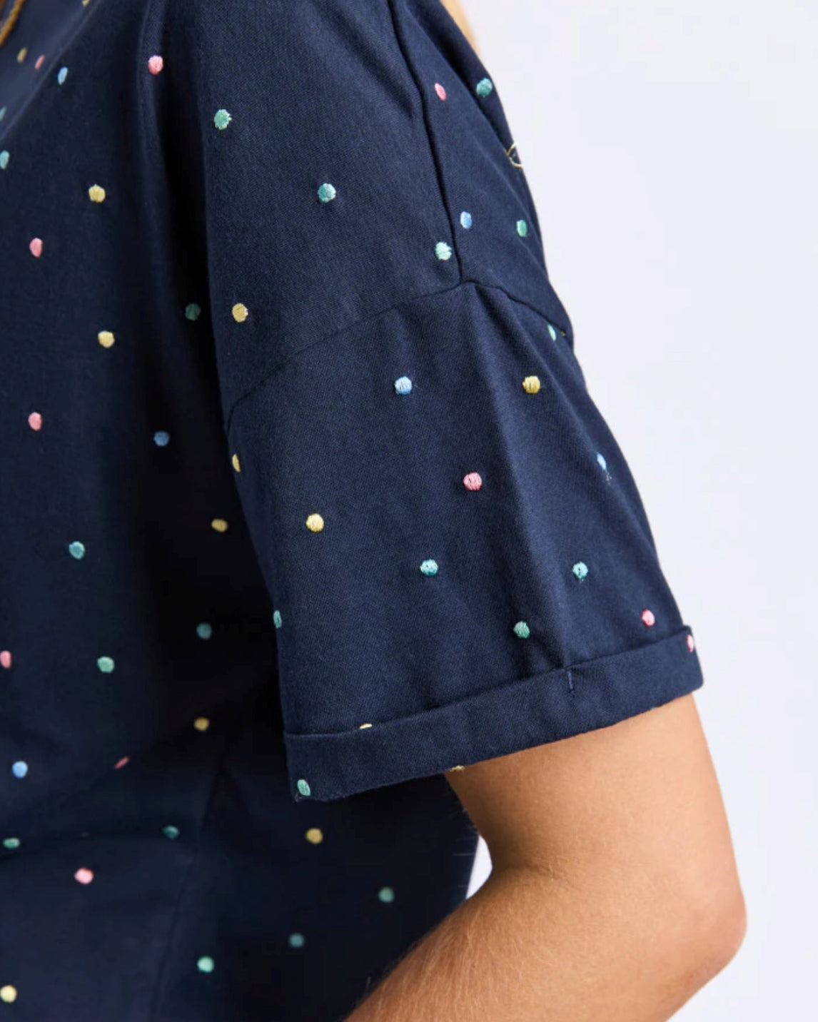 Add a pop of colour to your everyday style with the Festive Spot Tee by Elm Lifestyle. Made from soft, breathable cotton jersey, this easy-to-wear tee offers all-day comfort and a touch of playful charm. Featuring a navy base with the sweetest little multicoloured spots, it’s the perfect way to brighten up your casual wardrobe.
