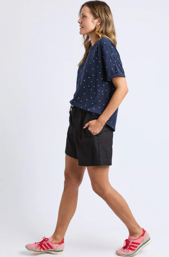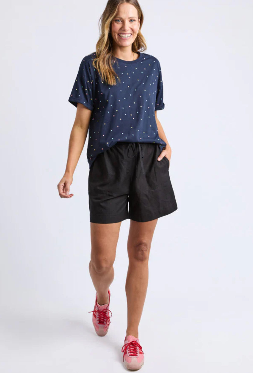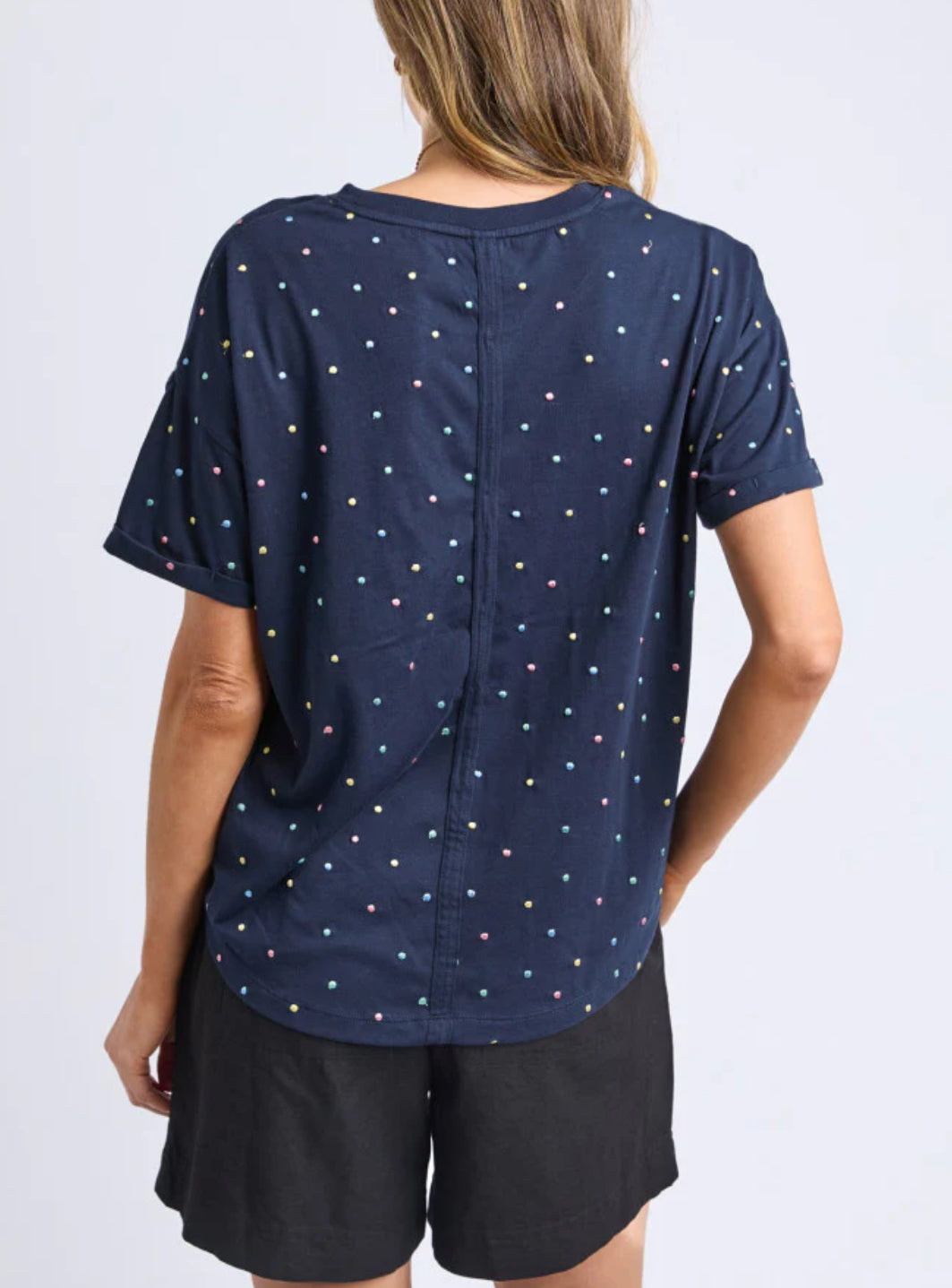 Add a pop of colour to your everyday style with the Festive Spot Tee by Elm Lifestyle. Made from soft, breathable cotton jersey, this easy-to-wear tee offers all-day comfort and a touch of playful charm. Featuring a navy base with the sweetest little multicoloured spots, it’s the perfect way to brighten up your casual wardrobe.