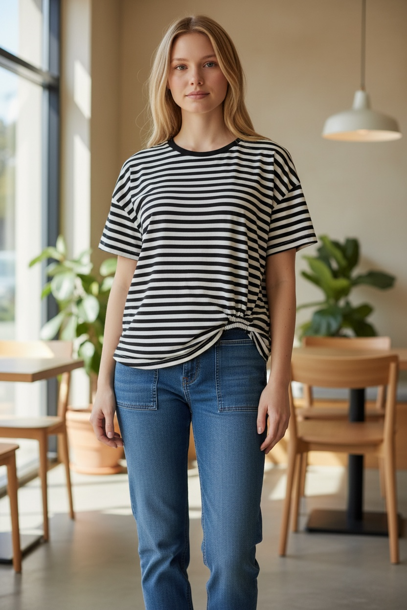 Elevate your everyday style with the Kenzo Choc Stripe—a versatile essential crafted from premium 95% cotton and 5% elastane for all-day comfort and movement. The sophisticated chocolate stripe pattern pairs beautifully with the modern faux tuck detail, creating an effortlessly polished look. Perfect for layering or wearing solo, this piece transitions seamlessly from casual to dressed-up occasions. Discover the perfect balance of comfort and contemporary design—add it to your wardrobe today.