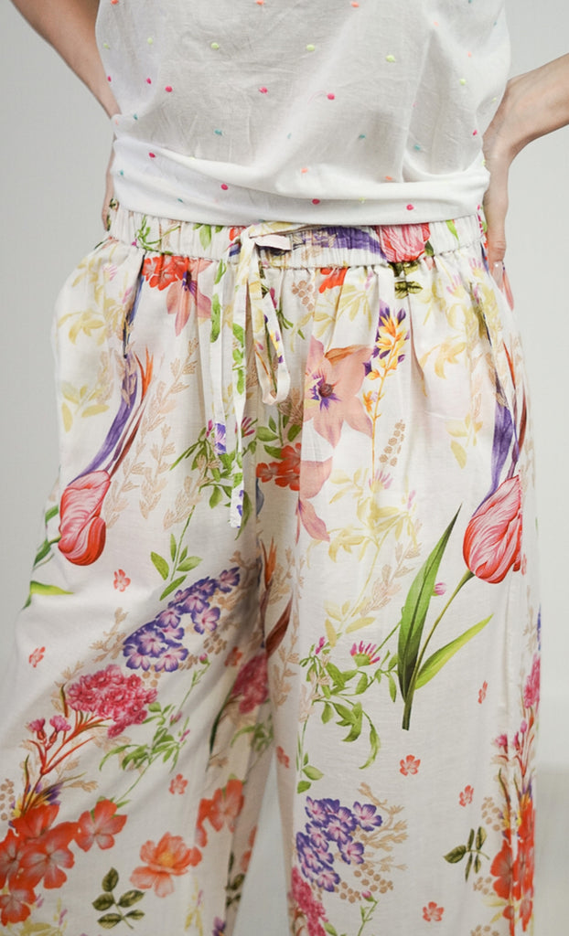 The Parrot Tulips Lounge Pants are crafted from 100% lightweight cotton voile, ensuring cool comfort and natural breathability. With a relaxed fit and an elasticated drawstring waist, they offer effortless movement while maintaining a flattering drape.