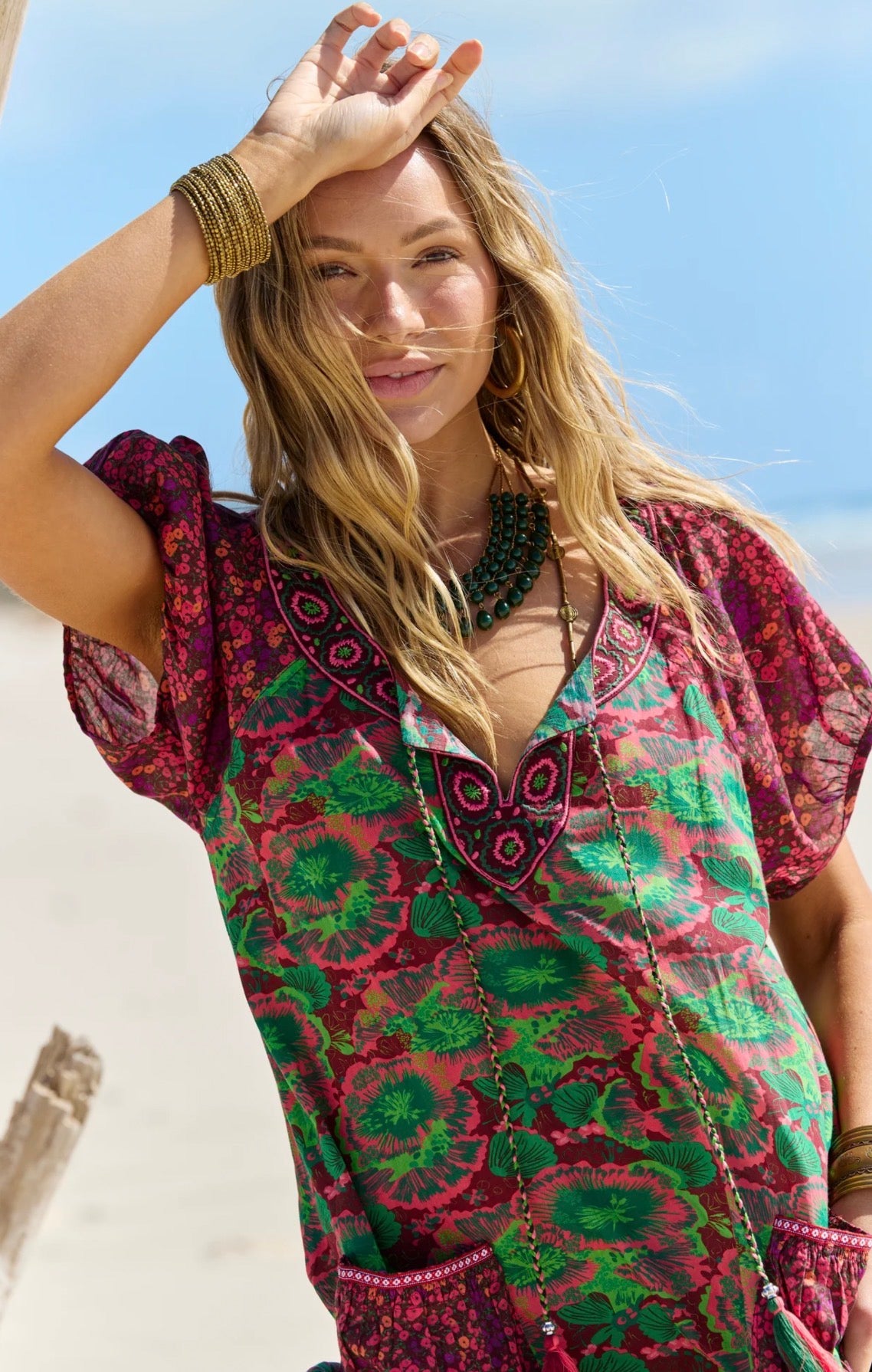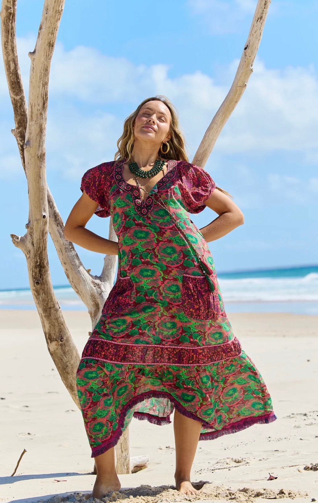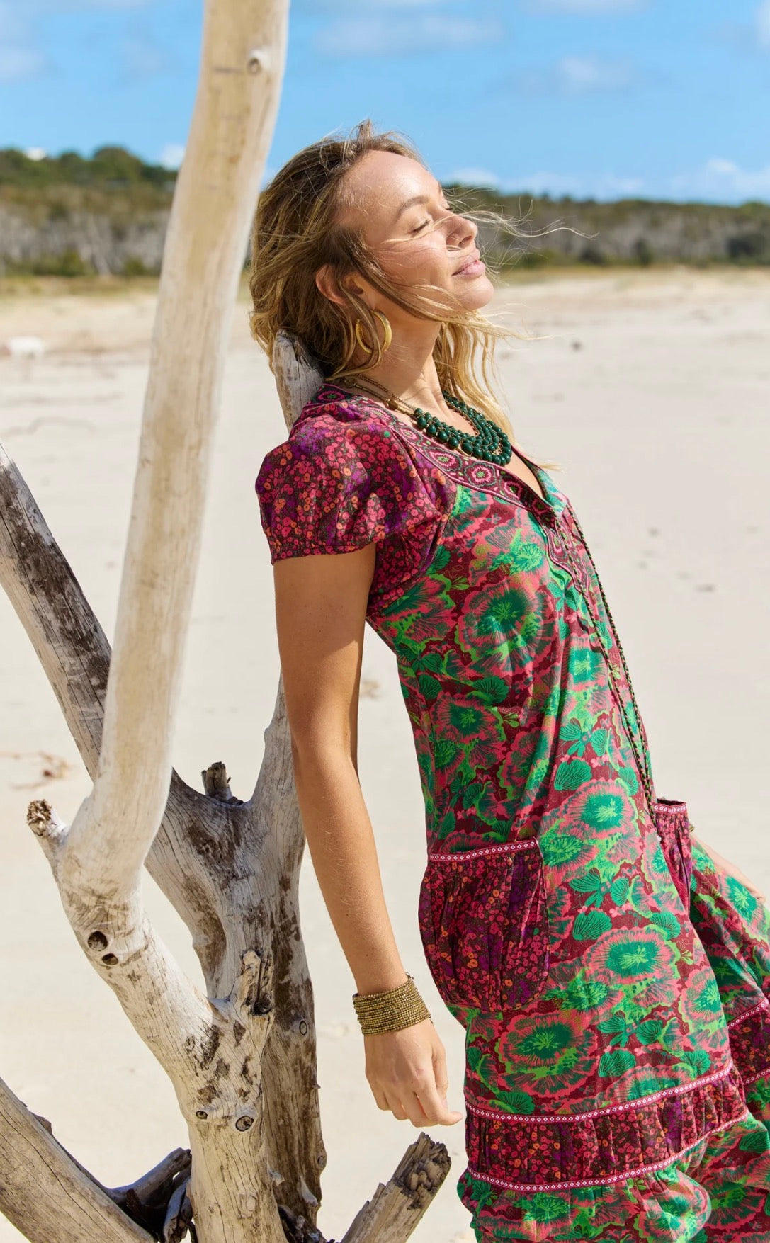 The Lagoon colourway showcases intricate patterns in soft pinks and fresh greens, creating a standout look ideal for resort wear and holiday wardrobes. Versatile and easy to style, this Naudic maxi dress can be worn day or night — dress it up with statement jewellery and heels for an evening event, or keep it casual with sandals for the beach, brunch or everyday wear. A timeless cotton maxi dress you’ll reach for season after season.