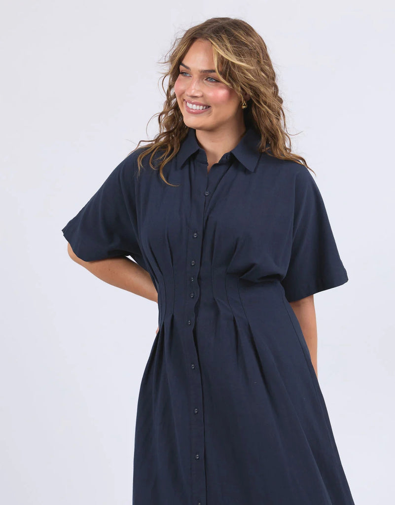 Meet your new go-to for effortless summer style — the Scarlet Midi Dress by Elm. Crafted for comfort and versatility, this chic shirt dress features a full button front, short sleeves, and flattering pleat detailing at the waist for a structured yet relaxed fit.