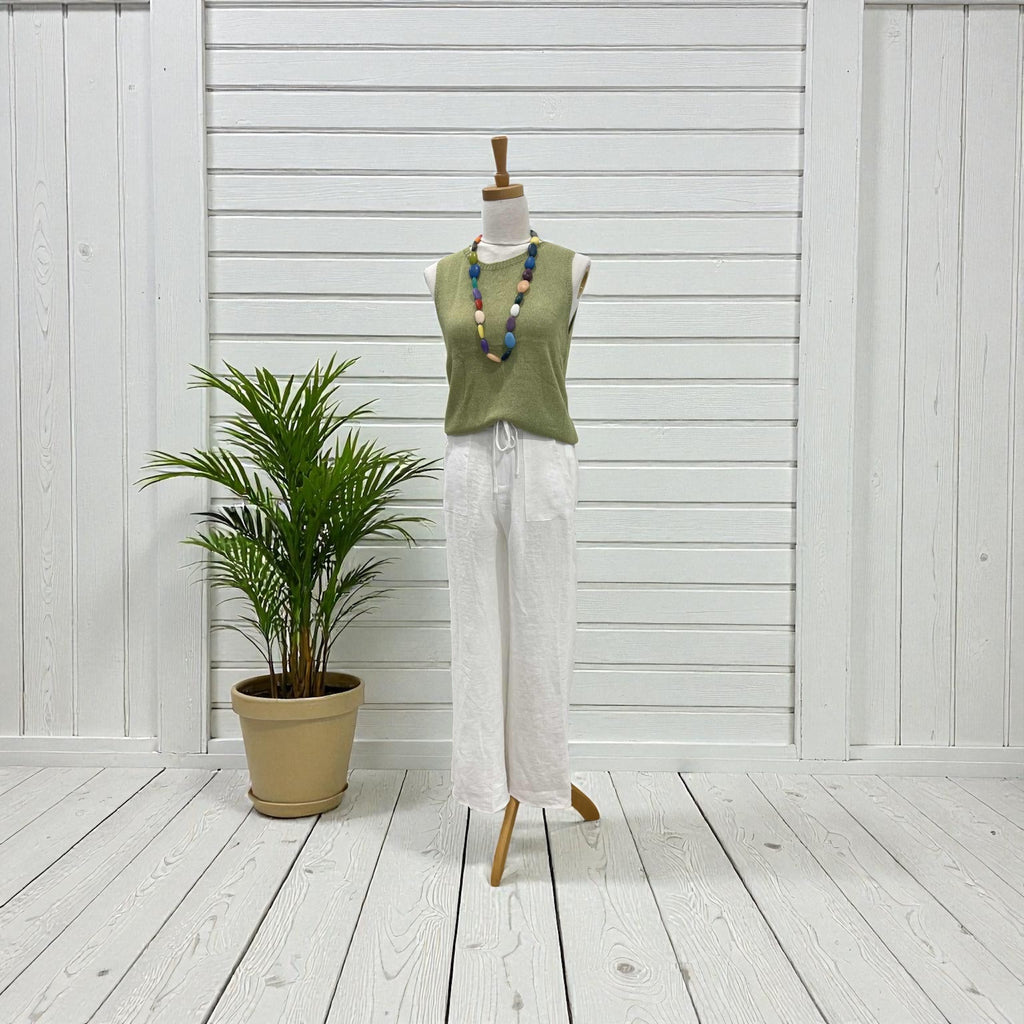 Elevate your warm-weather rotation with the Spring Tank in sage—a versatile essential crafted from a luxurious blend of linen, Tencel, and acrylic. The relaxed silhouette and round neckline deliver understated elegance, while subtle ribbed accents add refined texture. Lightweight and breathable, this sleeveless tank transitions effortlessly from casual days to elevated evenings. Discover the perfect foundation piece for your spring and summer collection—shop the Spring Tank today and experience natural fibre comfort with contemporary style.