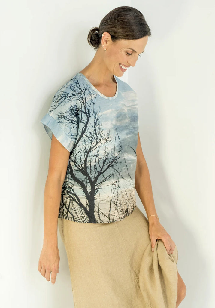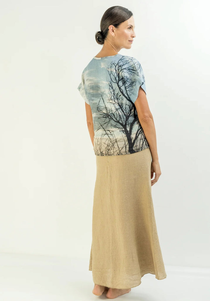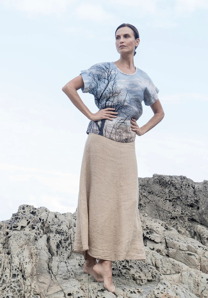 Inspired by the beauty of nature, the Stormy Skies Crimped Linen Tee features a breath-taking “stormy sky at sunrise” print — captured from an original photograph taken at North Head, Manly, Sydney. This artistic piece showcases Harriet Jane’s signature style, blending Australian landscapes with timeless, wearable design.
