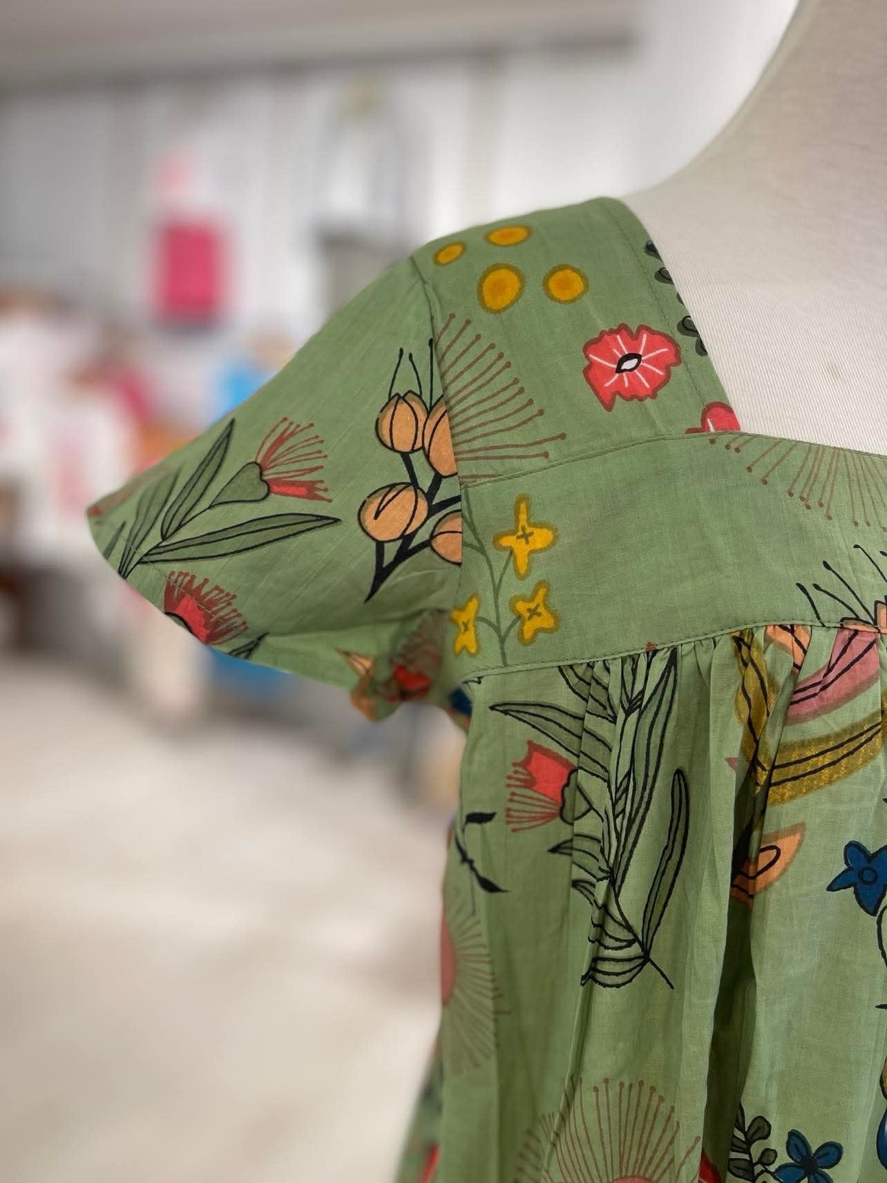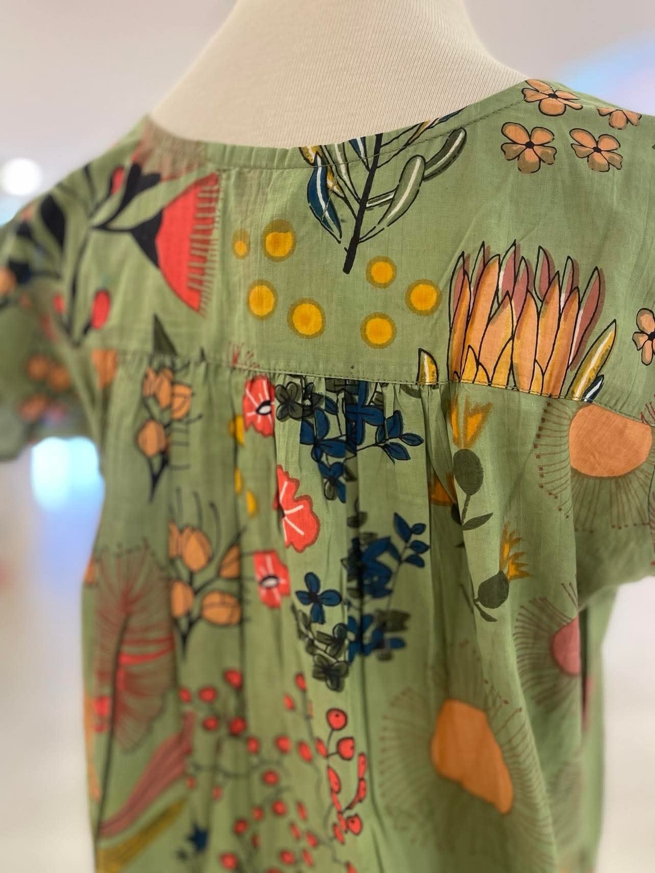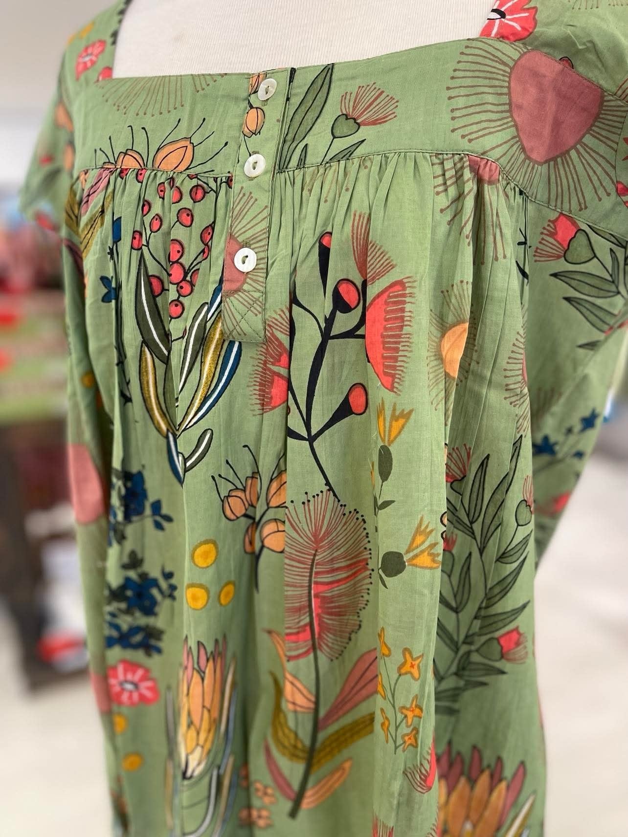 Sleep in effortless comfort with the Protea Nightie in a timeless olive green. Made from 100% breathable Indian cotton, this lightweight nightie features a beautiful floral print of protea flowers, offering a soft, feminine look with a natural, calming tone.