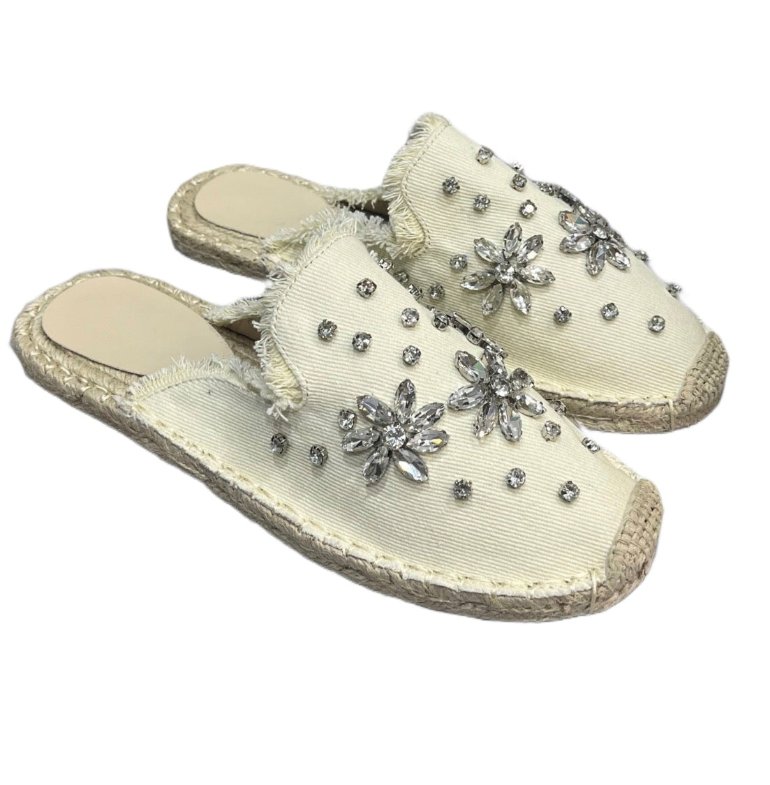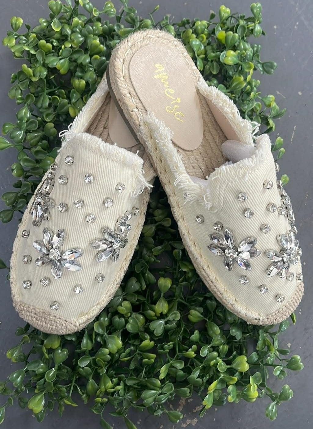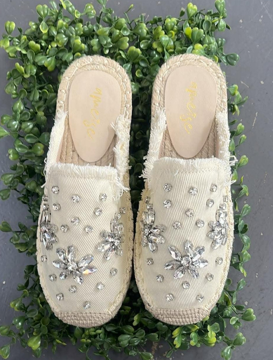 The Evie Espadrille Slides by Ameise add a touch of vintage-inspired charm to your warm-weather wardrobe. Crafted from denim fabric, these closed-toe espadrille slides are beautifully adorned with sparkling diamante flowers for a soft, feminine finish. The ivory tone paired with delicate silver diamantes creates an elegant shimmer that elevates even the simplest outfit.