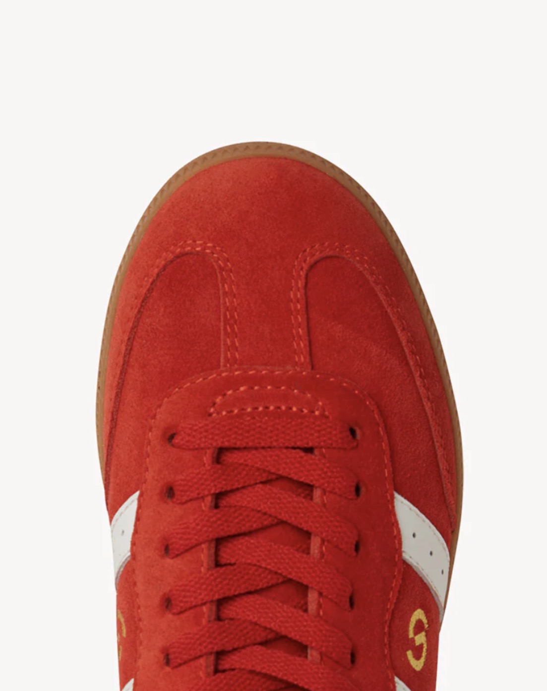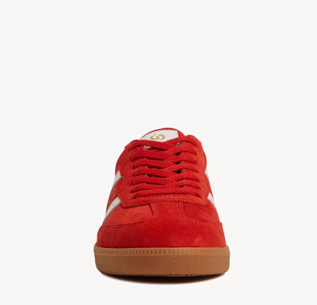 - Aurora Red suede and white waxy leather with a parallel overlay design