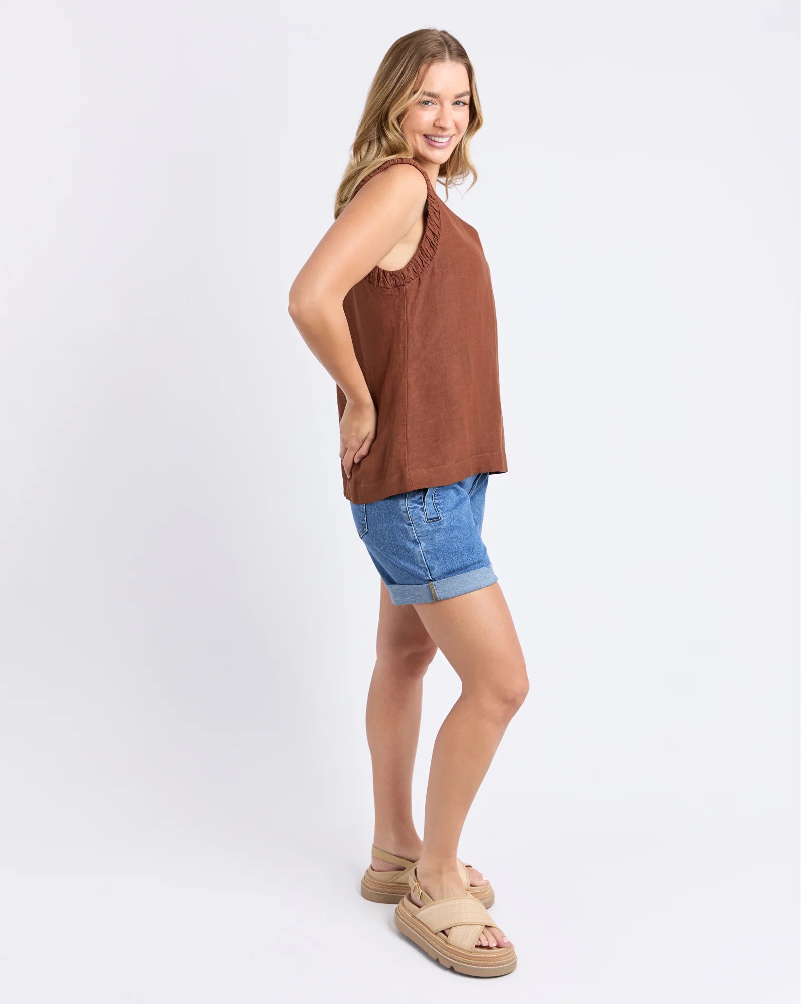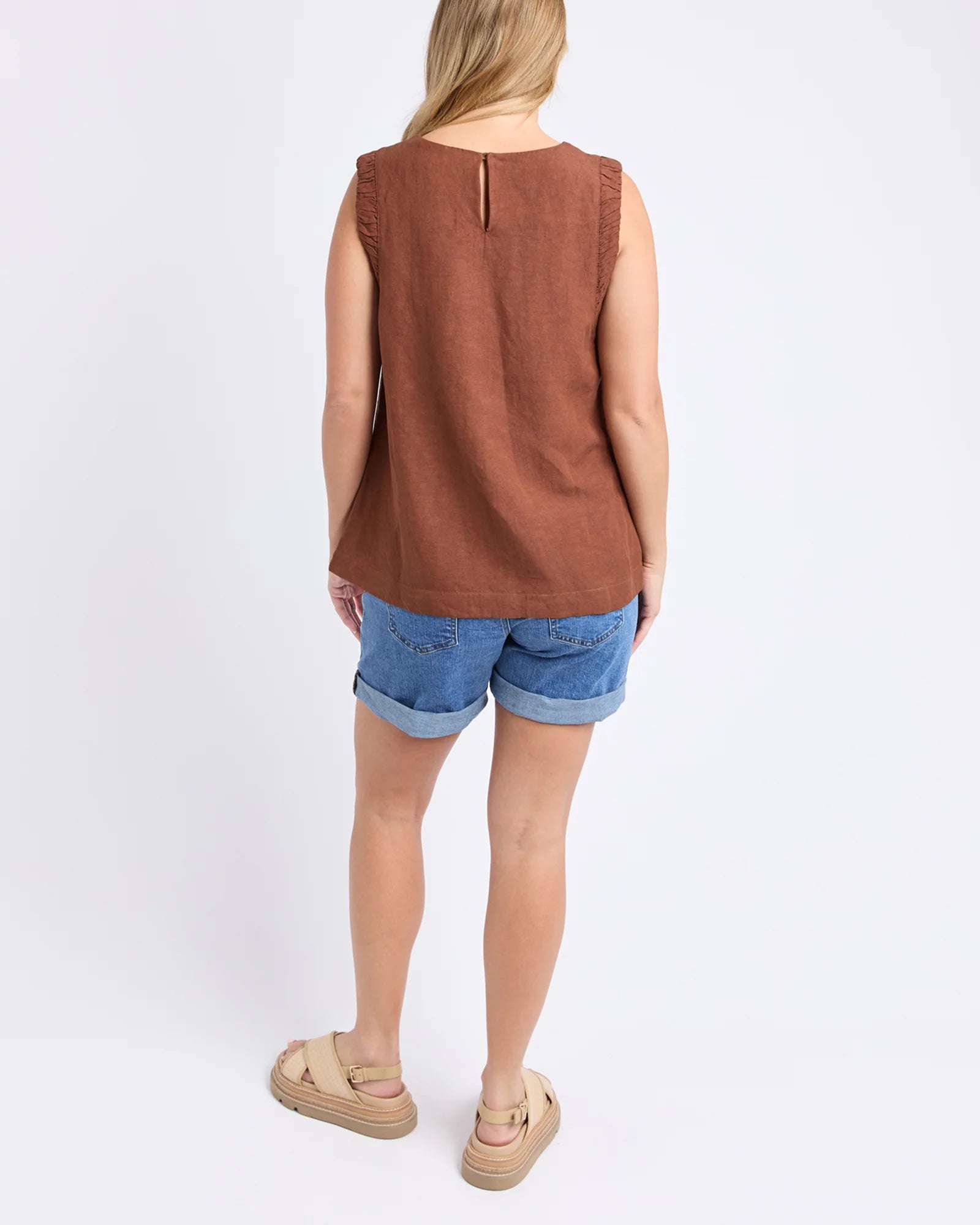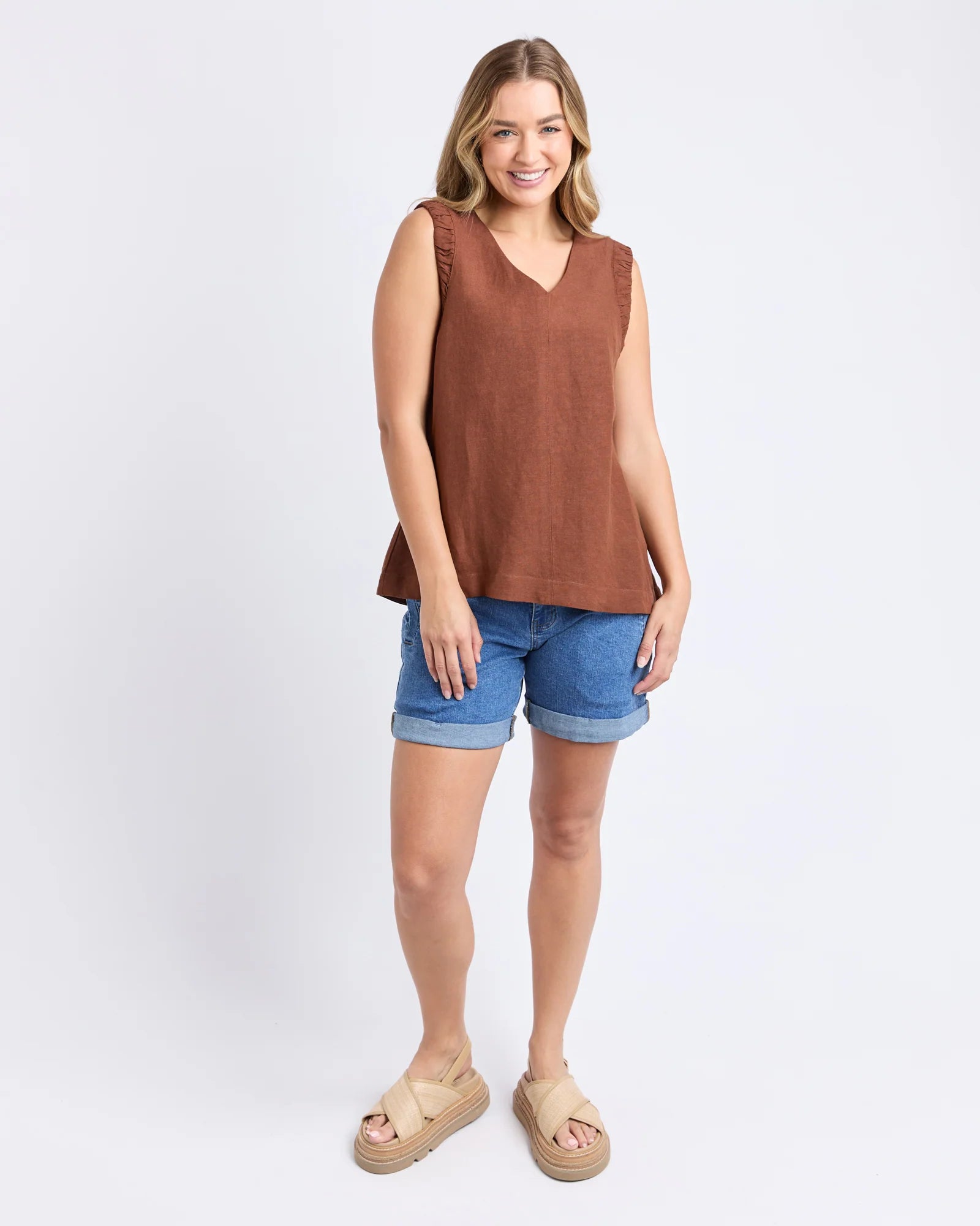 The Bermuda Top is all about relaxed summer vibes. With its linen blend feel, playful frill detail and clean V-neckline, it is a style that looks just as good dressed up as it does casual.