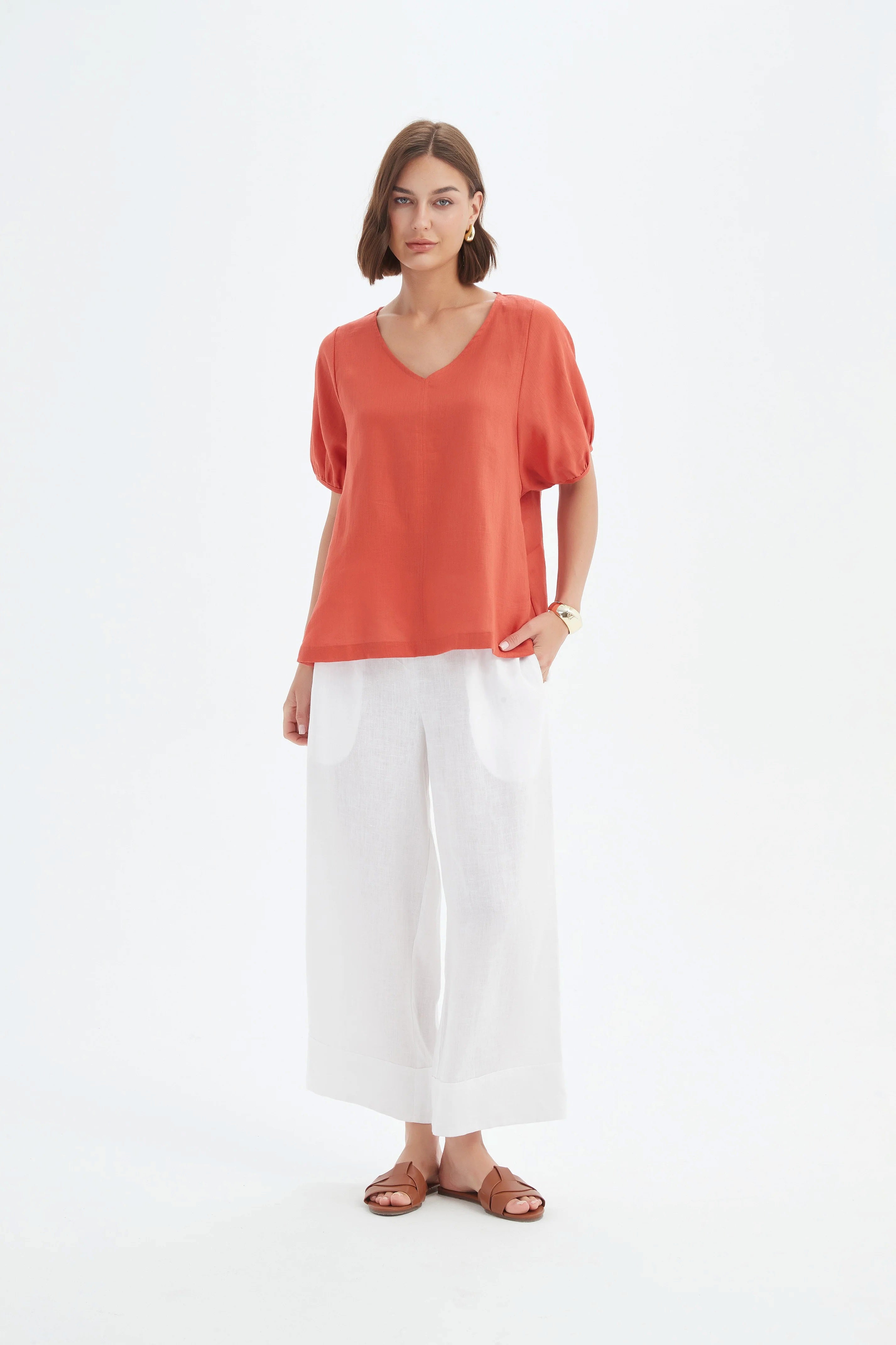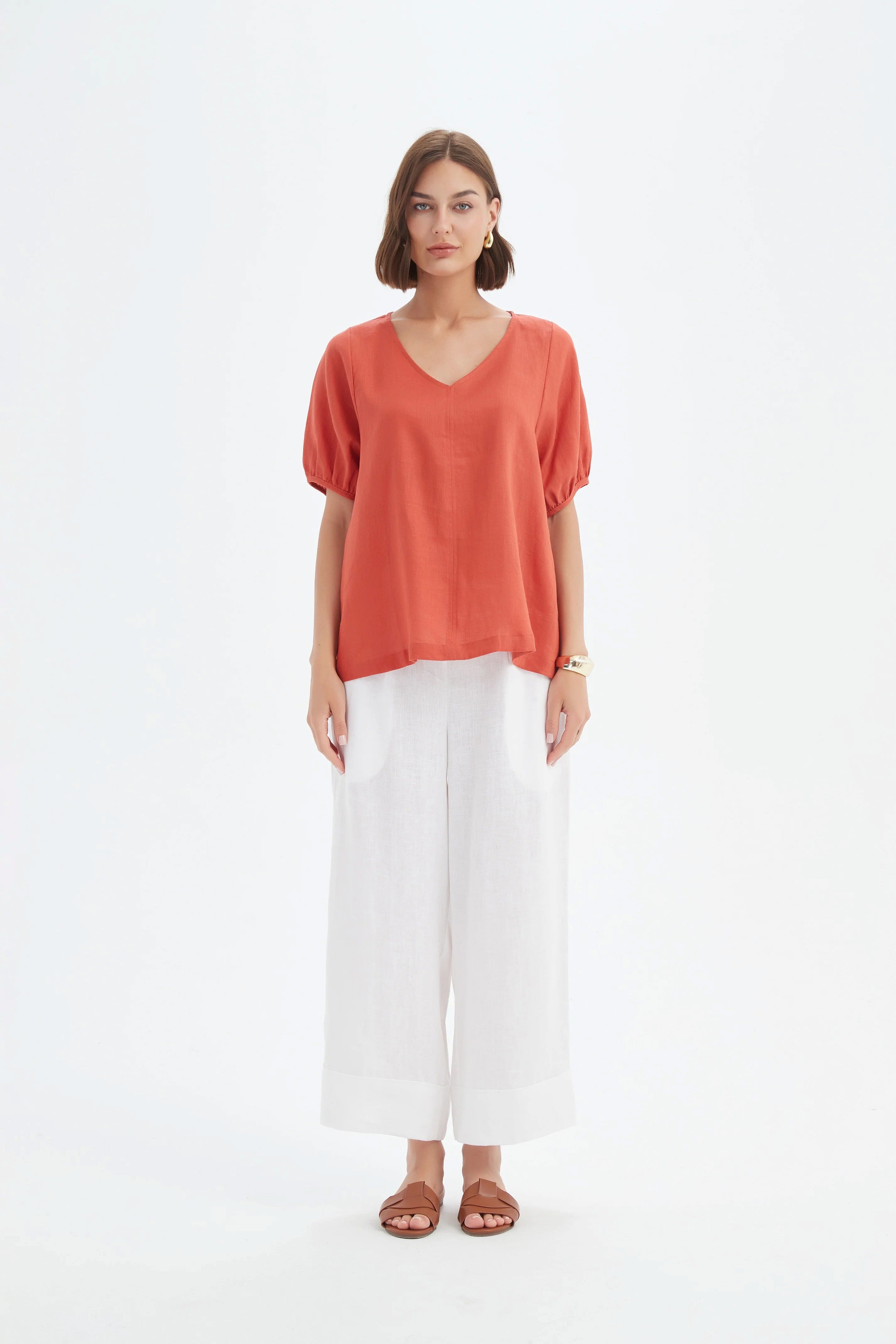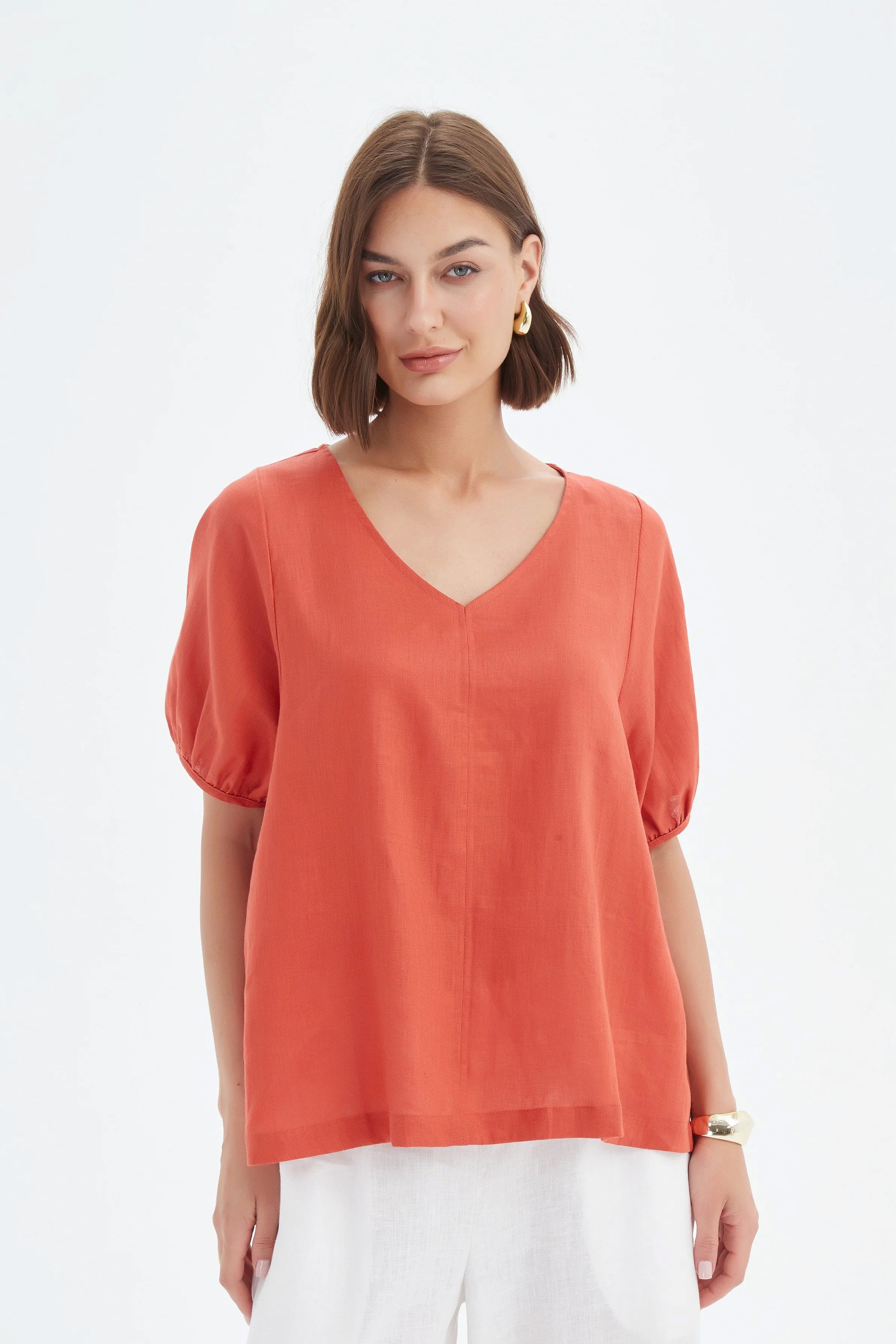 Designed with a flattering V-neckline and a relaxed silhouette, this top by Tirelli drapes gracefully over the body for a comfortable yet polished look. The softly gathered bishop sleeves add a touch of femininity and movement, giving this tee a stylish twist on a classic shape. Versatile and easy to style, it pairs perfectly with denim, tailored trousers, or linen skirts, making it a must-have for both relaxed weekends and effortless weekday wear.