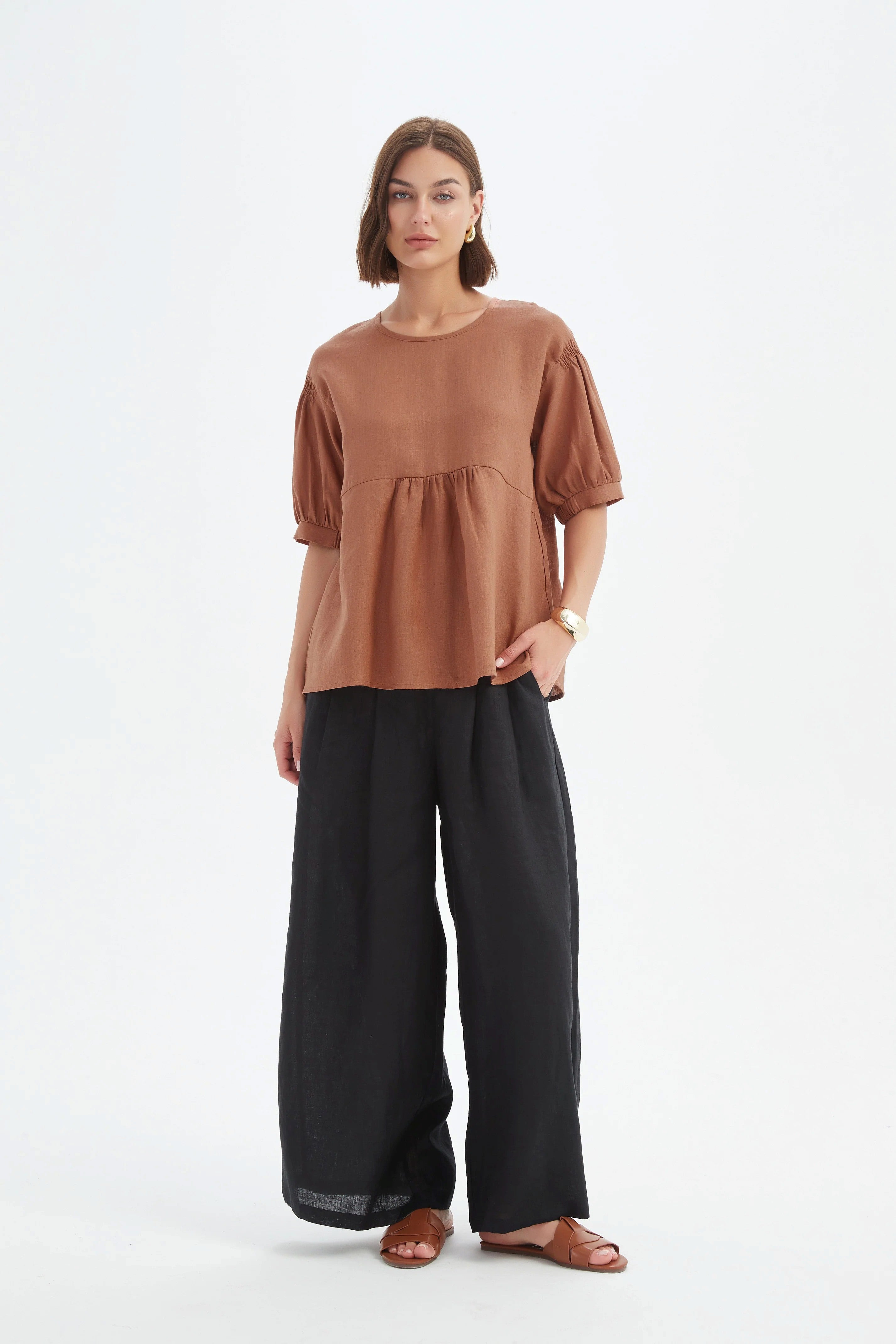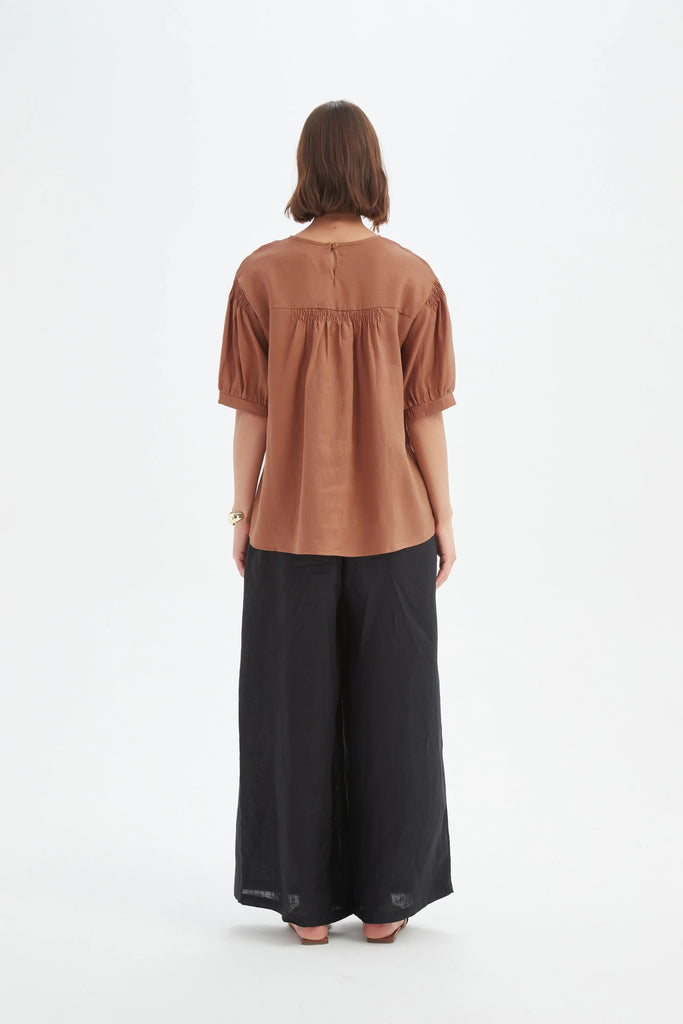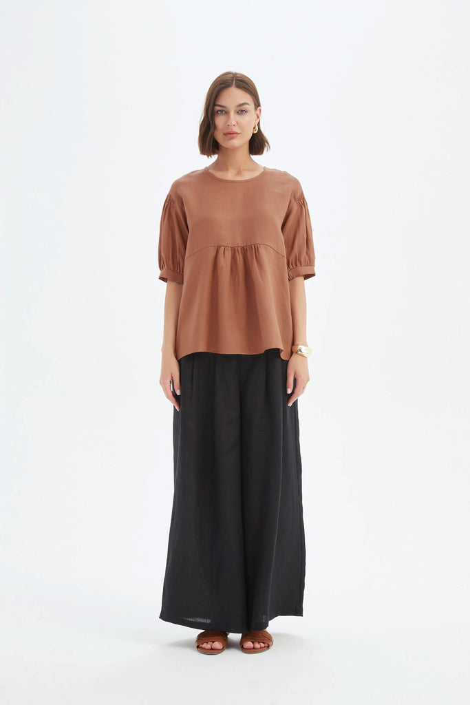 The rich cedar brown hue adds warmth and versatility, making this linen blouse perfect for pairing with denim, skirts, or tailored pants for effortless everyday wear.