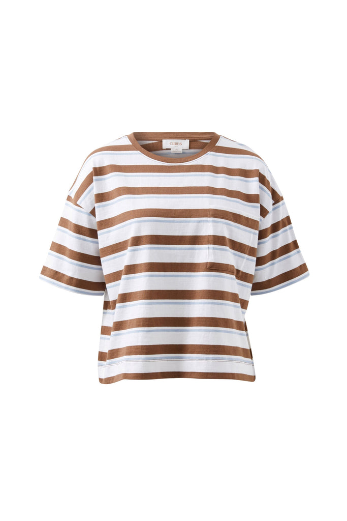 The Boxy Pocket Tee is relaxed, effortless, and sustainably made. Crafted from beautifully soft Australian cotton, this boxy-fit tee offers a slightly cropped silhouette with a relaxed longer sleeve and wide hemline for laid-back comfort. Featuring fresh horizontal stripes in chocolate brown and pale blue on a white background, it’s a timeless piece that brings easy style to your everyday wardrobe.