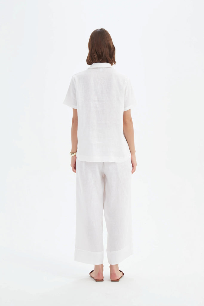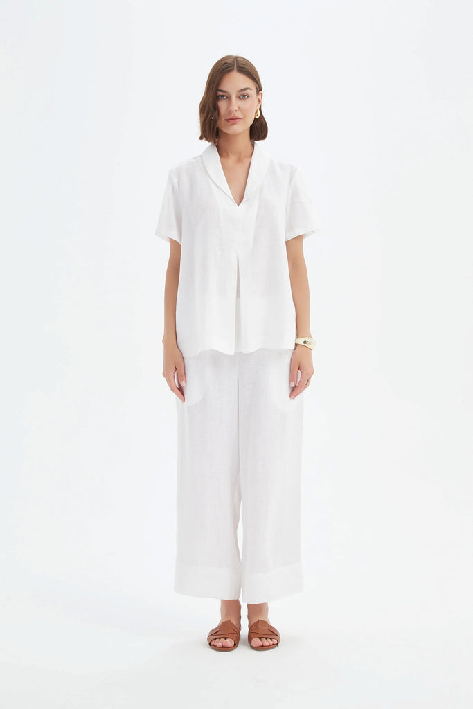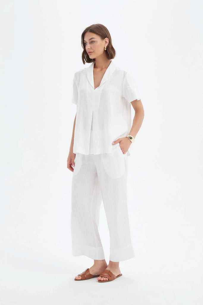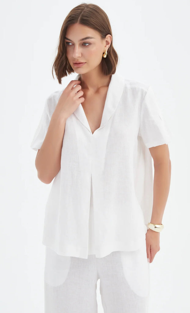 Its short sleeves and relaxed fit create a modern silhouette that transitions seamlessly from work to weekend. Available in classic white, this timeless piece pairs beautifully with tailored pants or casual linen separates for effortless sophistication.