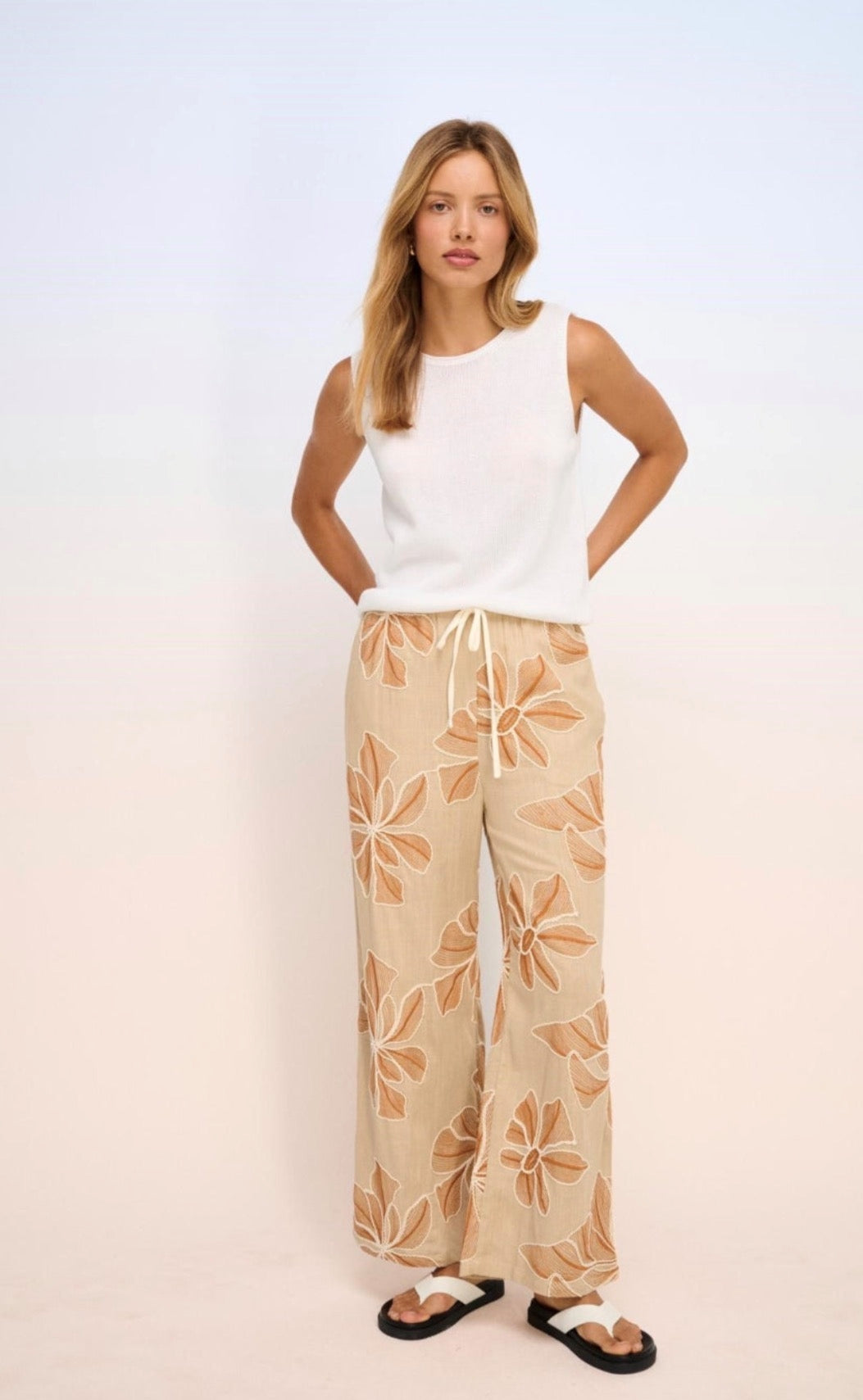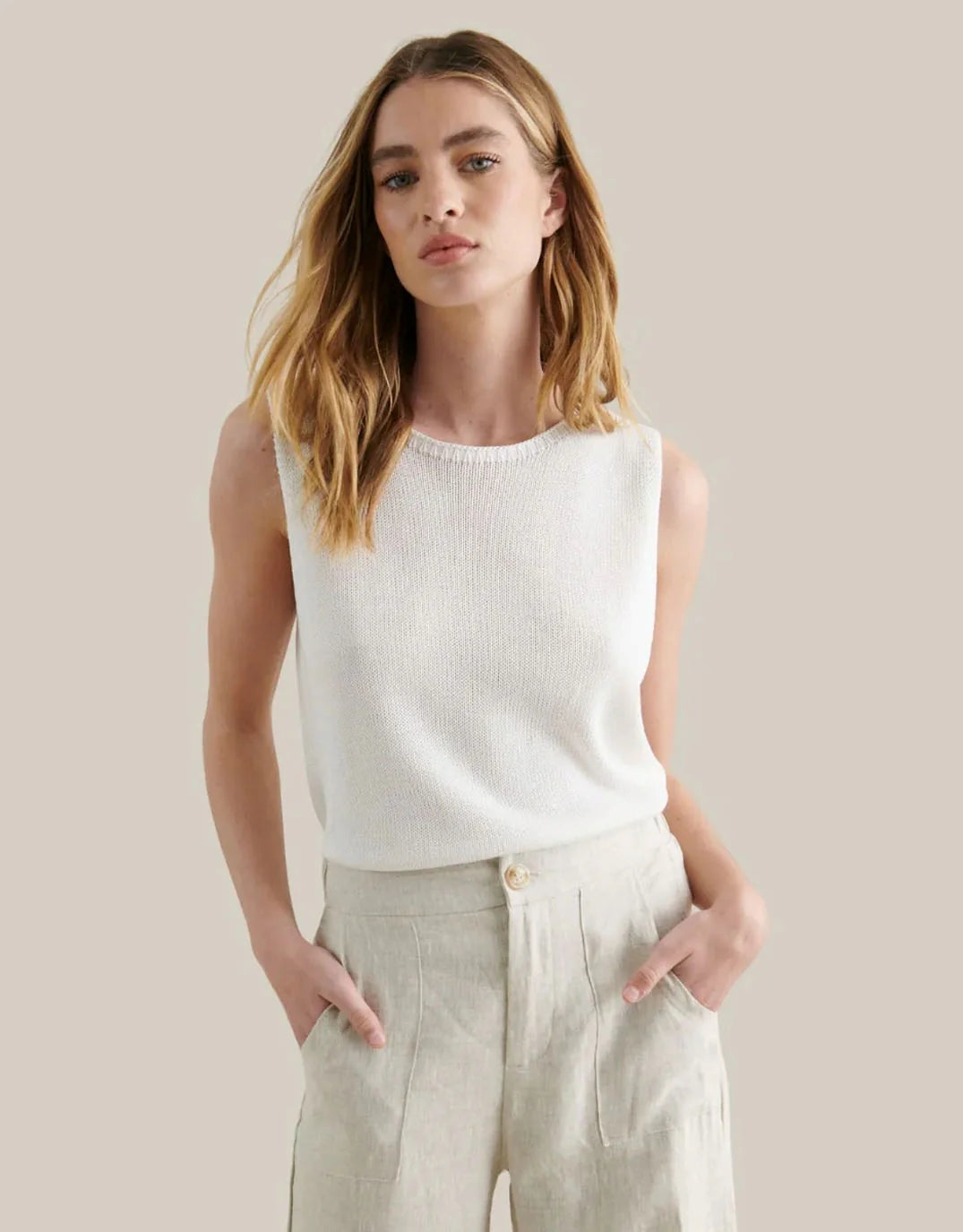 Featuring a soft creamy white hue, this knit tank pairs seamlessly with denim, linen pants, skirts or tailored trousers, making it an easy go-to for everyday styling. The relaxed yet flattering fit allows it to be dressed up or down, whether styled casually with jeans and sneakers or elevated with statement jewellery and sandals.