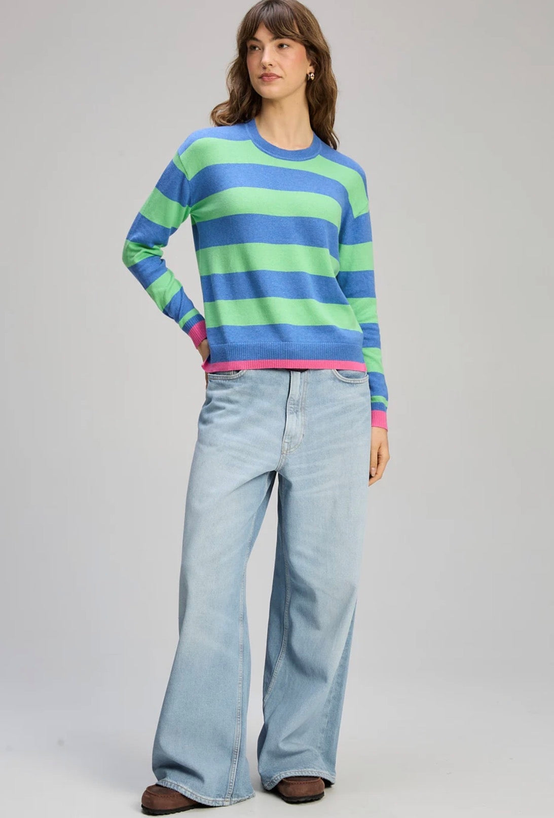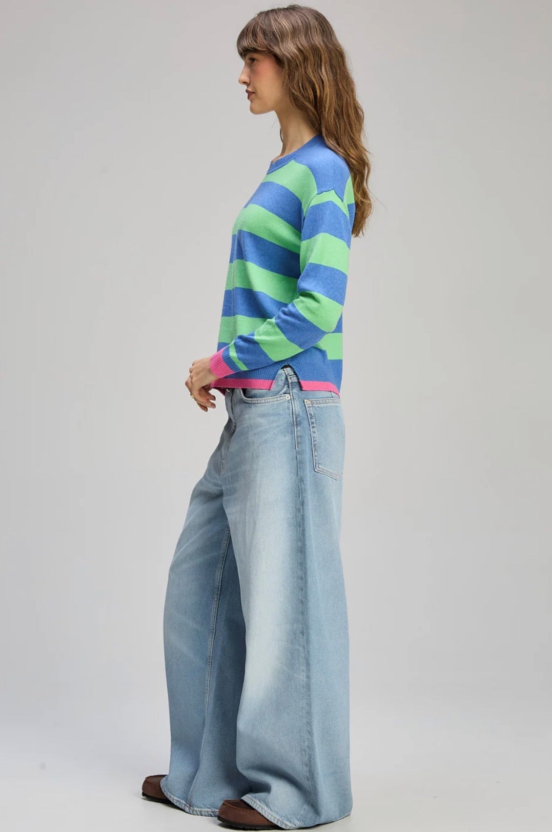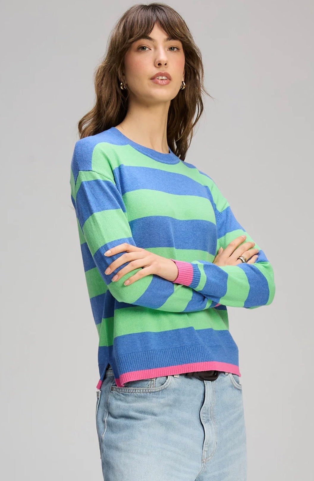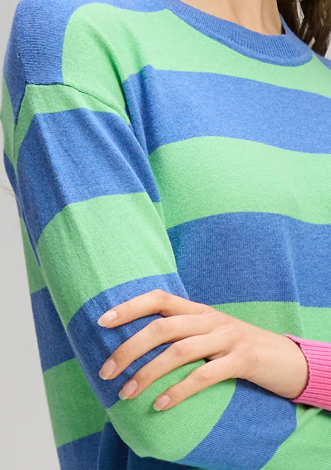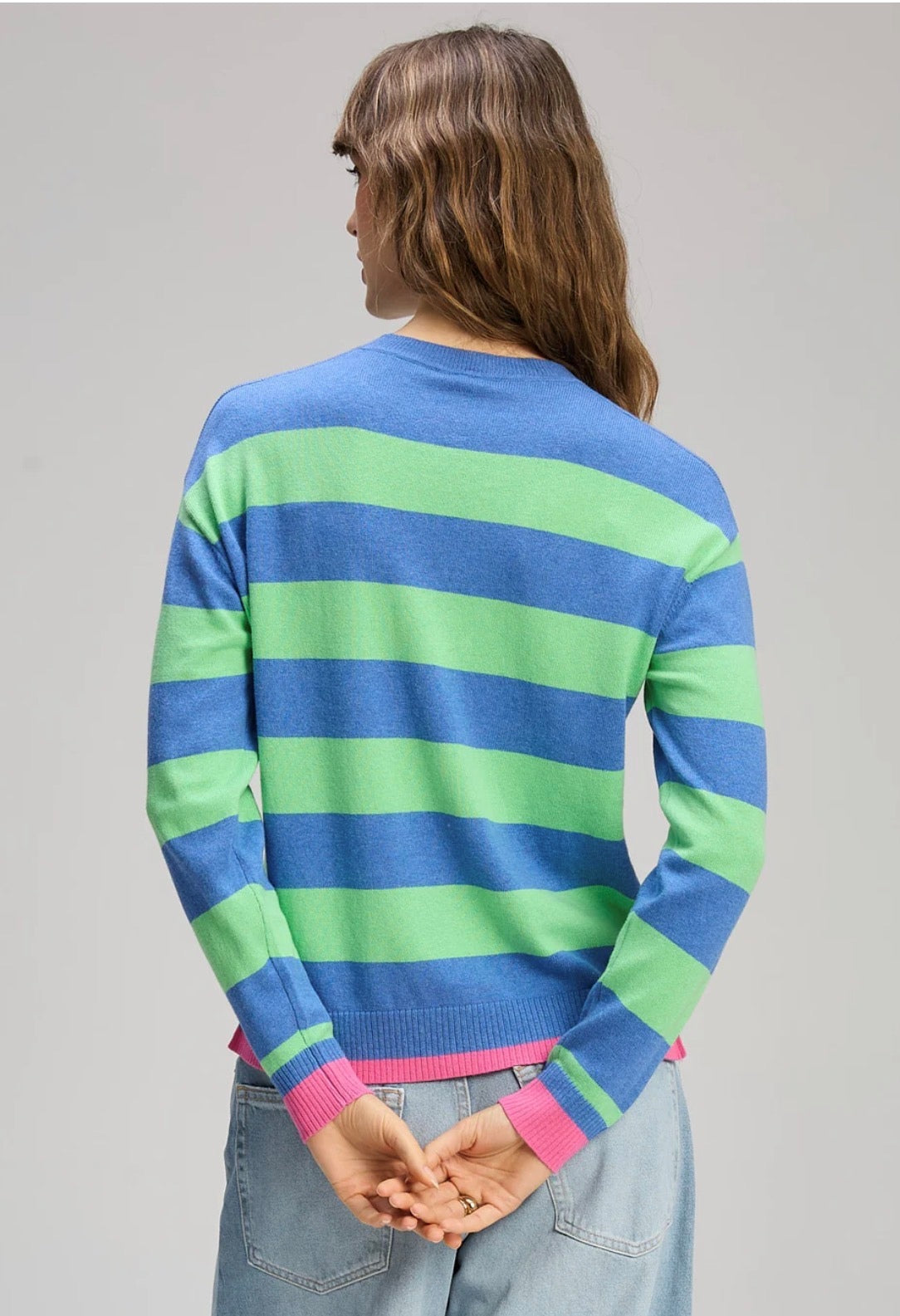 Brighten your everyday wardrobe with the Stripe Clash Jumper by Zaket & Plover. This vibrant women’s knit features bold green and blue stripes with playful pink trims, bringing colour and personality to a classic silhouette. Designed with a relaxed fit and subtle side splits, it’s an easy, comfortable piece that adds movement and effortless style.