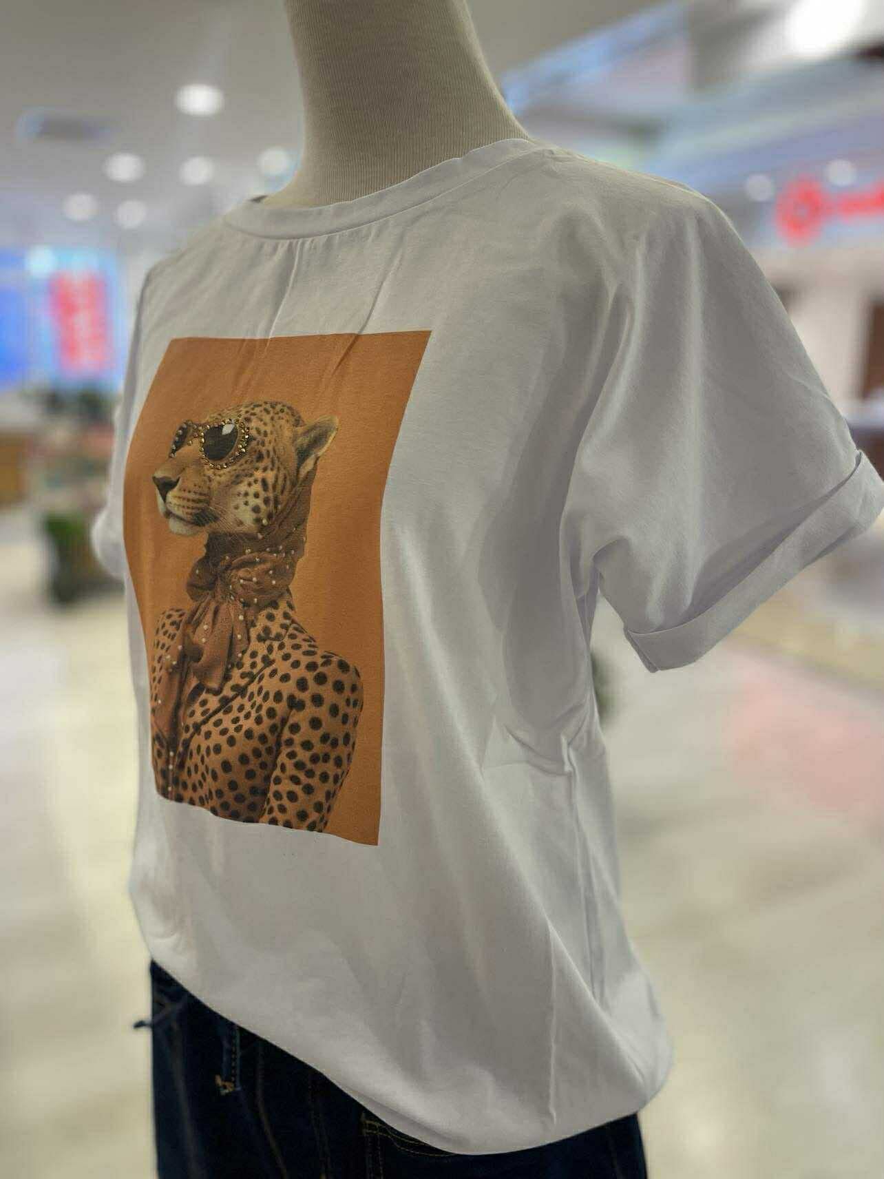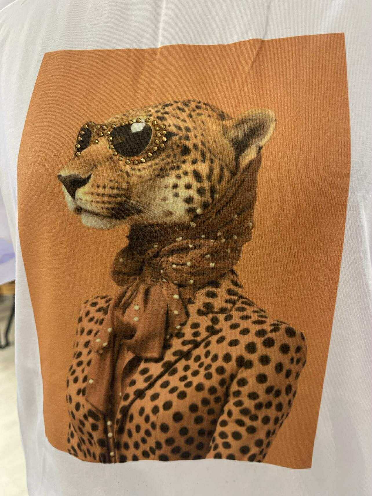 Add a touch of fun and flair to your wardrobe with the Tatiana Leopard Tee, a standout piece that blends style with personality. This crisp white tee features a beautifully detailed graphic of a fashionista leopard dressed in a chic scarf, oversized sunglasses, and a leopard-print jacket. The sunglasses are embellished with tiny crystals, adding a subtle sparkle that makes the design truly pop.