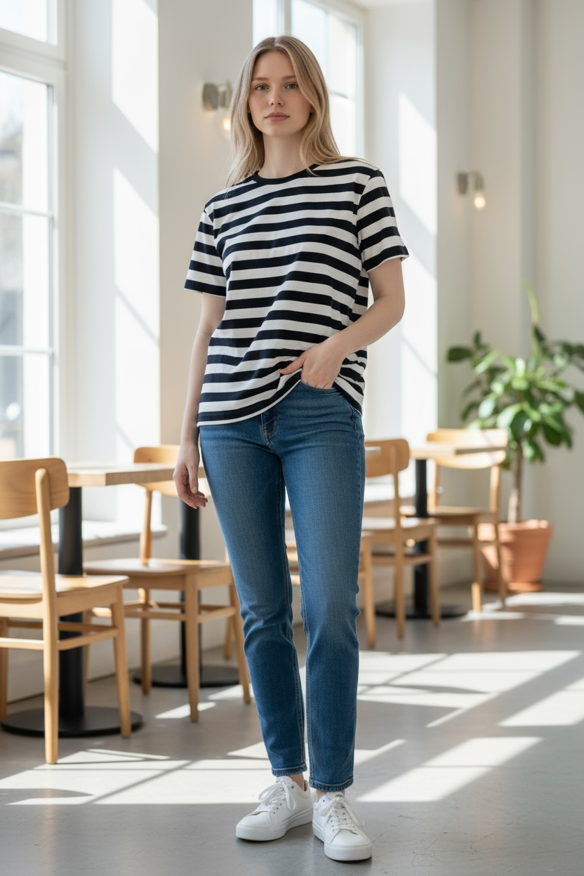 Step into effortless style with the Tilly Stripe Tee, featuring a relaxed fit that prioritizes comfort without compromising on looks. The cotton spandex blend provides gentle stretch and breathability, while the classic stripe pattern works with any outfit. Designed for those who value ease and versatility, this tee is ready for whatever your day brings. Shop now and make it your new favourite piece.