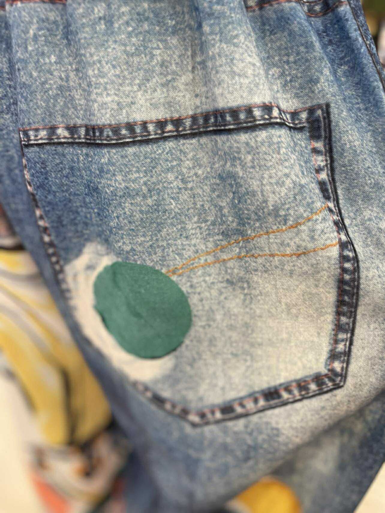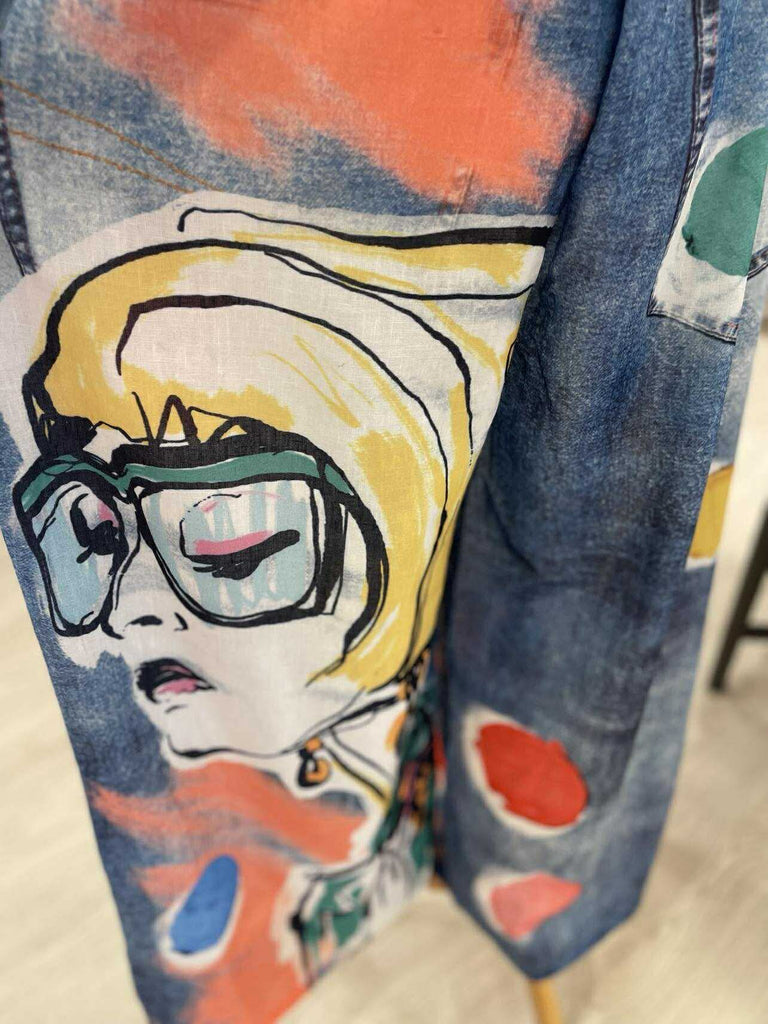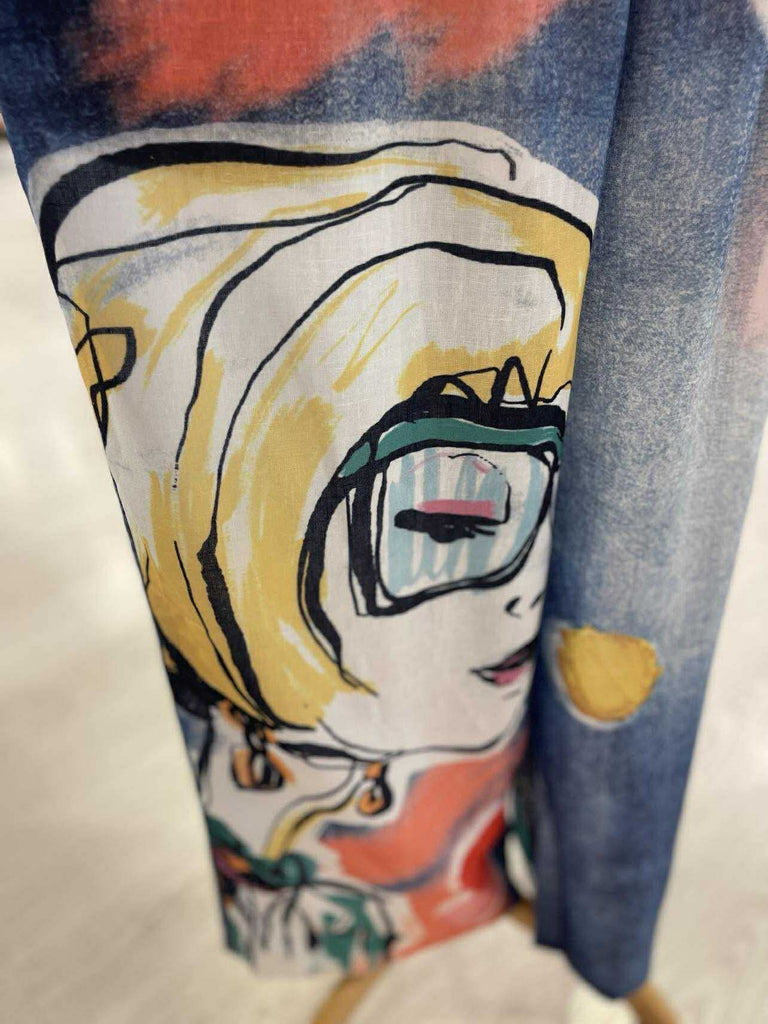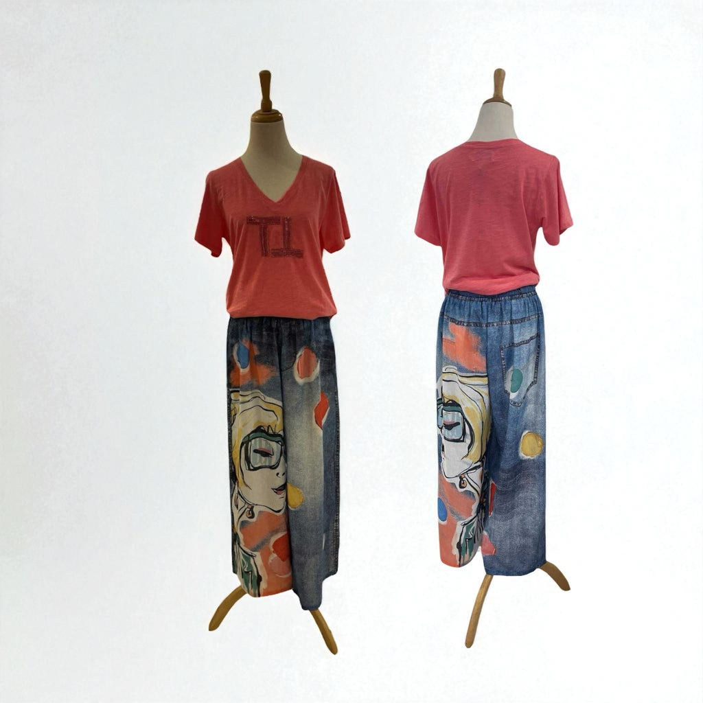 Step into effortless style with the Abstract Face Pants Ghetto. Crafted in Italy from a linen/poly blend that mimics denim, these wide-leg pants offer comfort and a chic look. Featuring an elastic waist for easy wear, functional front pockets, and stylish faux back pockets, they combine practicality with trend-forward design. Elevate your wardrobe—grab yours now!