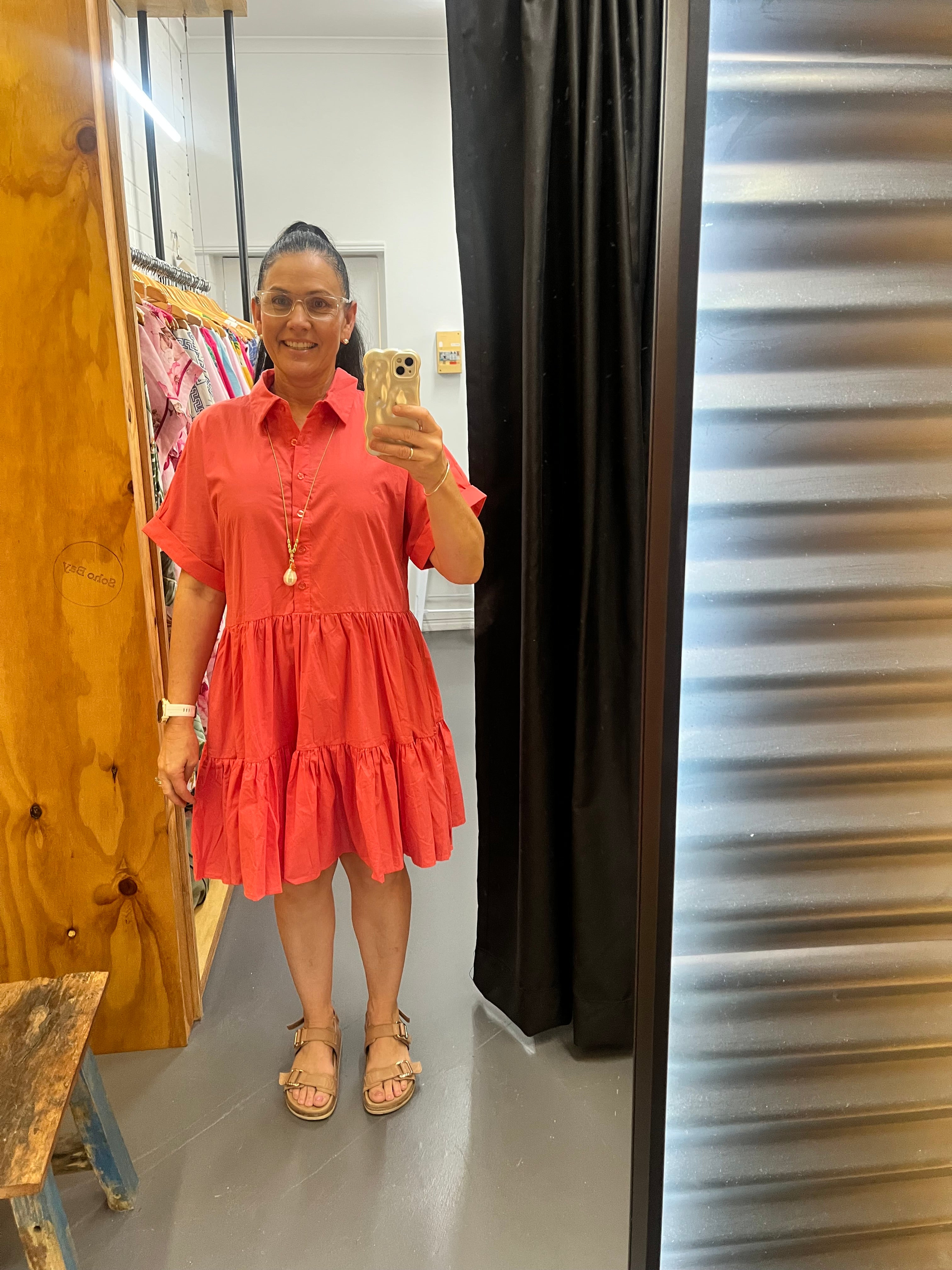 The Ally Dress in Red is your next wardrobe essential. This 100% cotton dress combines comfort with style, featuring eye-catching tiered layers that add movement and visual interest. Front buttons extend to the waist seam, while cuffed sleeves and a neat collar provide a refined finish. The warm red hue with subtle orange undertones creates a flattering, distinctive look. Perfect for any occasion, from weekend brunch to evening gatherings. Shop the Ally Dress now and experience effortless elegance that works as hard as you do.