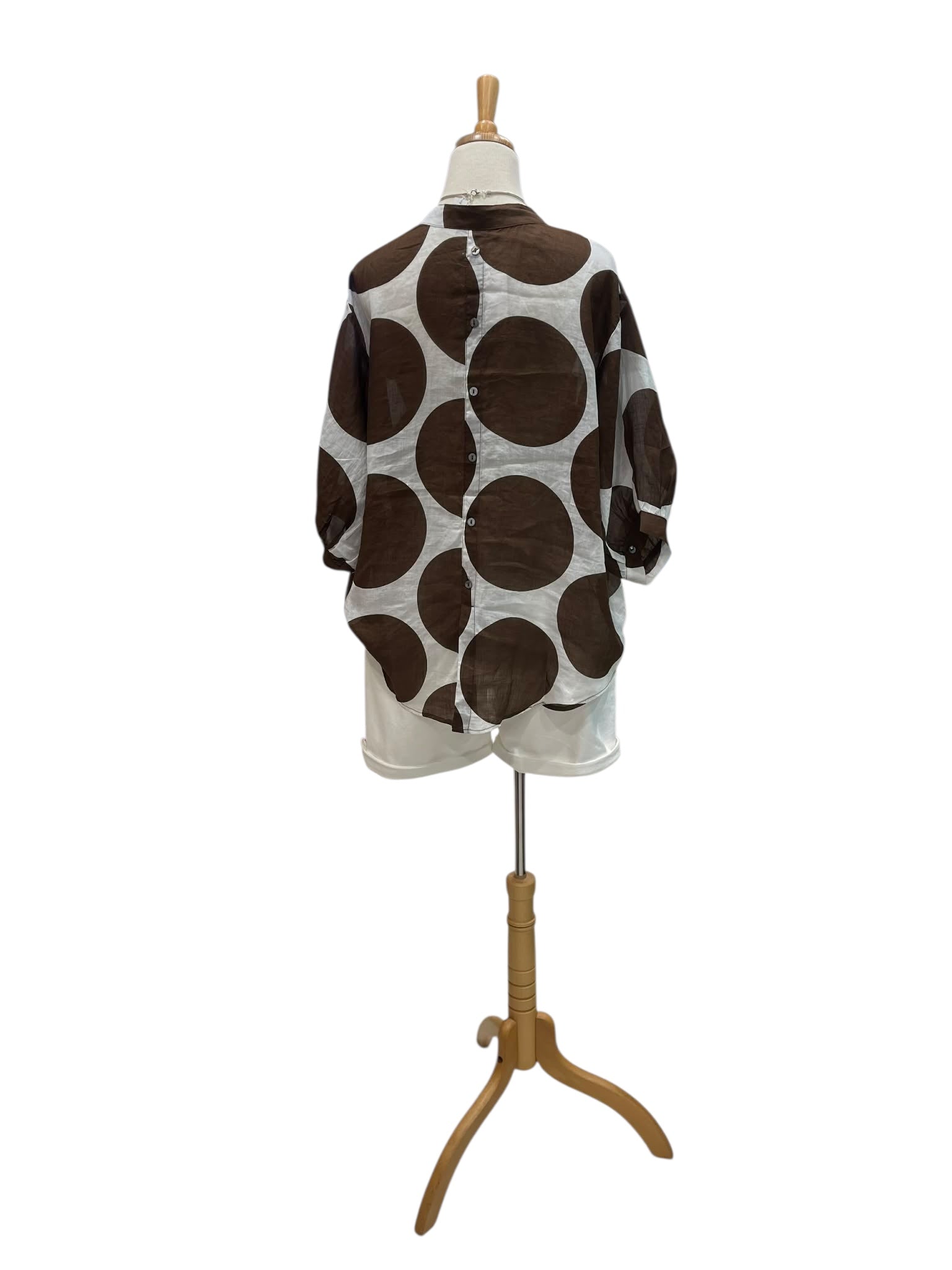 Experience effortless style with the Coco Linen Dot Shirt, crafted from 100% linen in a classic chocolate spot design. The distinctive button detail running down the back adds a touch of understated sophistication to this wardrobe staple. Breathable and versatile, it's perfect for warm weather dressing. Make the Coco Linen Dot Shirt your go-to piece—shop now and refresh your collection.